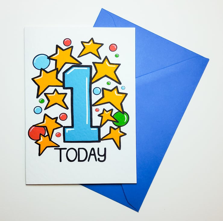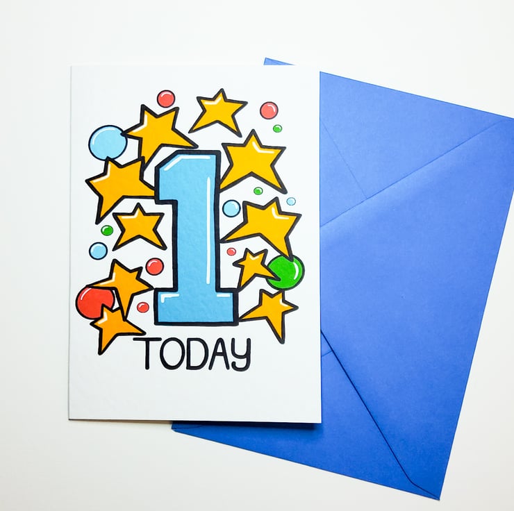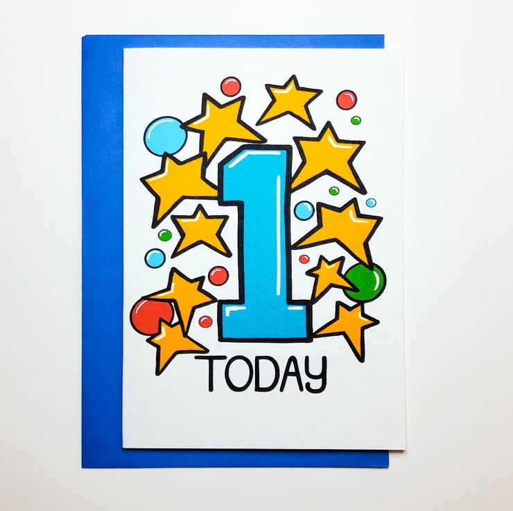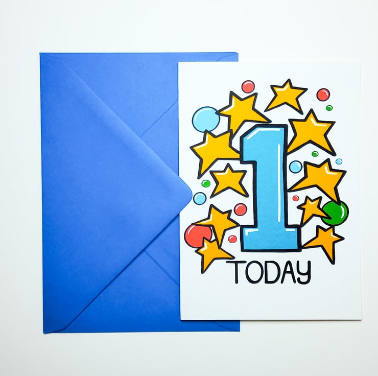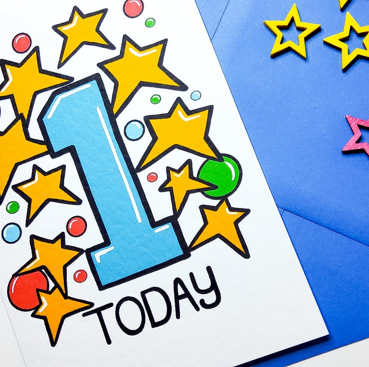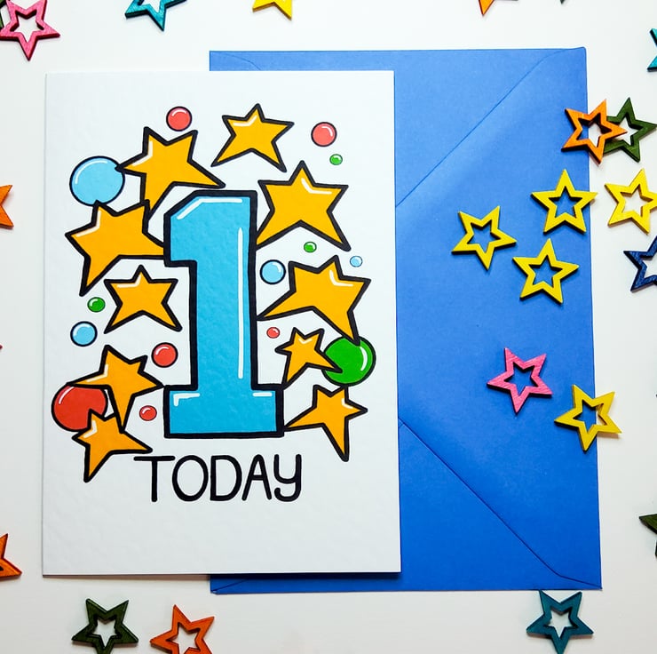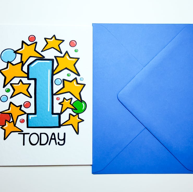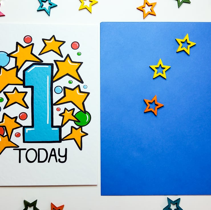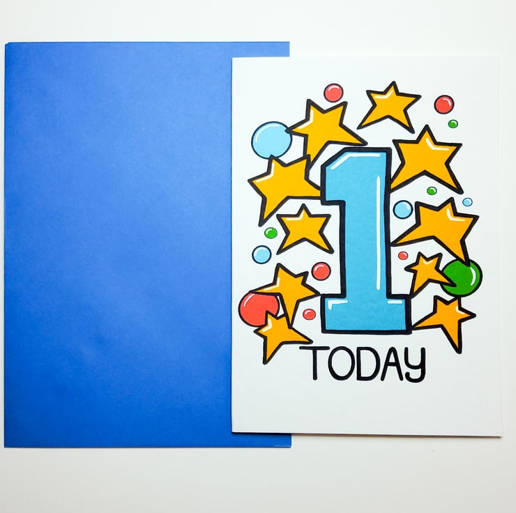 I wanted to create a simple bright and colourful card for First Birthday, this one is baby blue with golden stars and multicoloured bubbles floating up, perfect for 1 year old Baby / Child Birthday