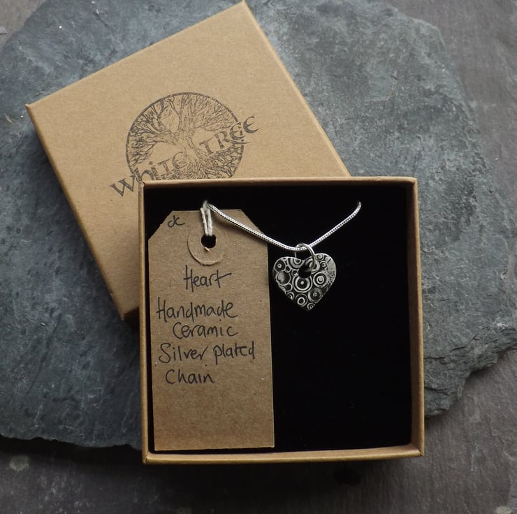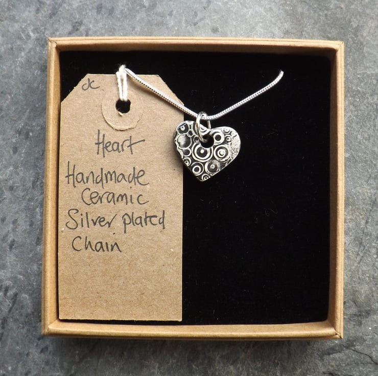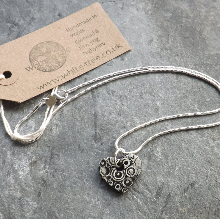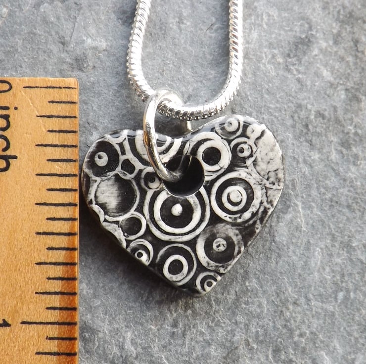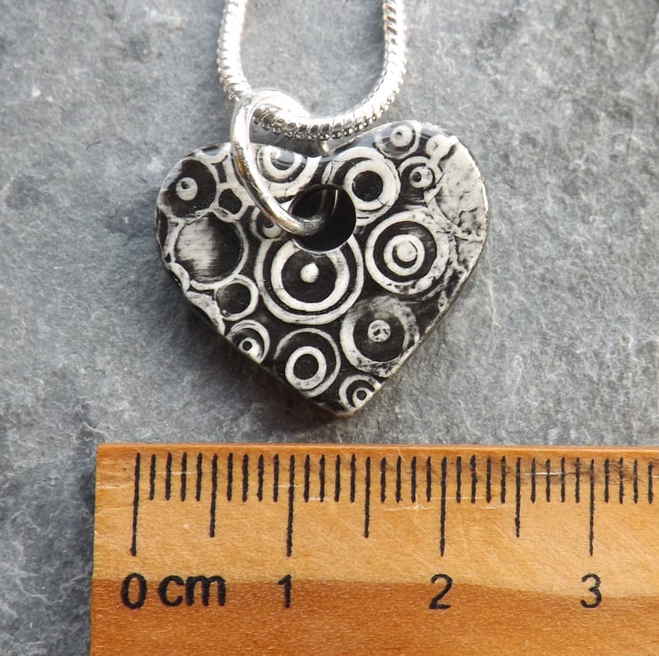 This little heart shaped pendant has washes of black across a textured ripples pattern, leaving shades of black and grey with white on the ripples.