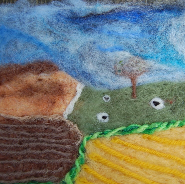 A needle felt countryside scene of fields.