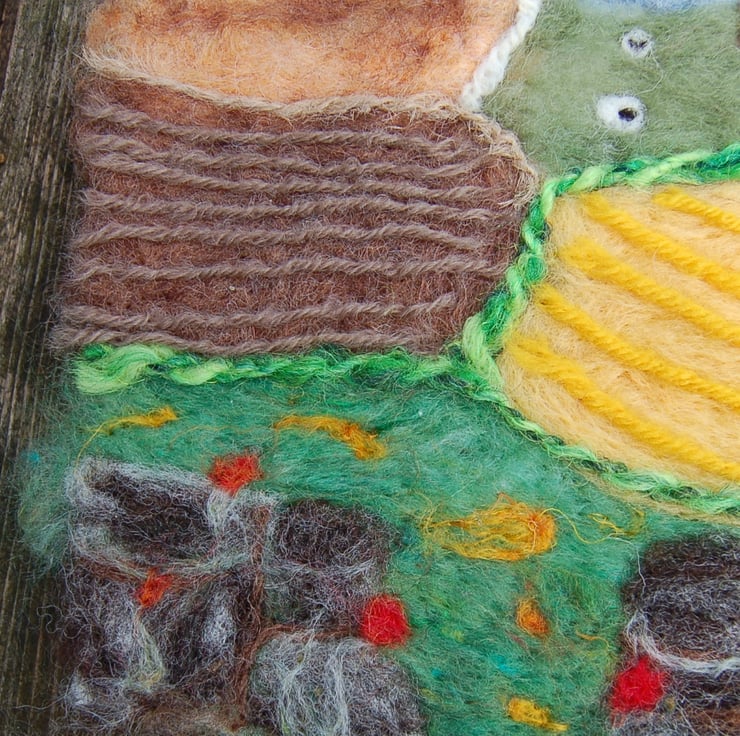 I first made a outline drawing directly onto the wool blanket and then worked the fields. Added detail includes pieces of wool yarn, some is hand spun yarn, some are pieces from my wool stash. The dry stone wall is from natural coloured Jacobs fleece.