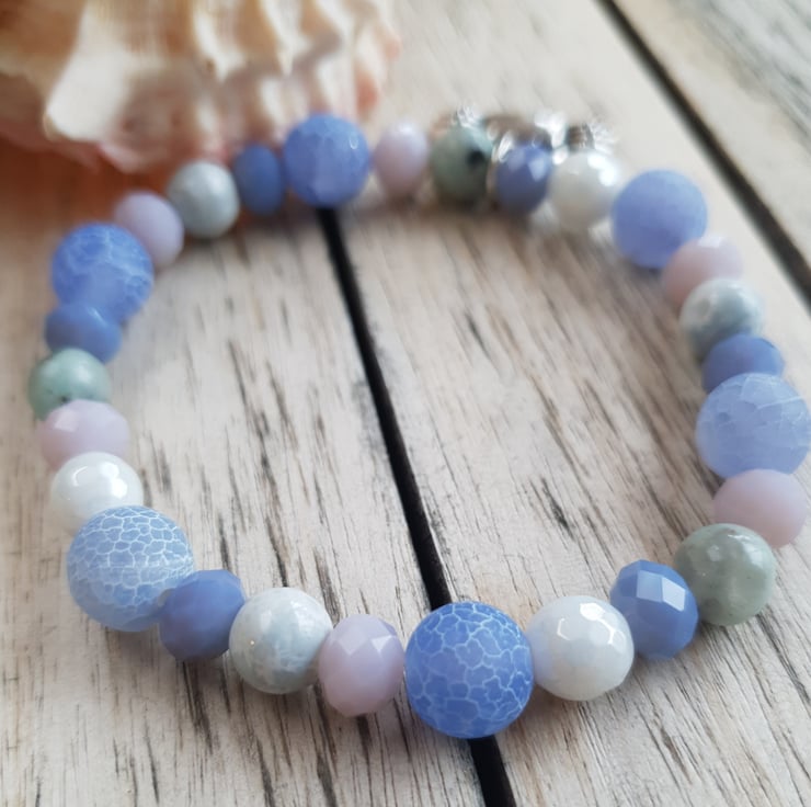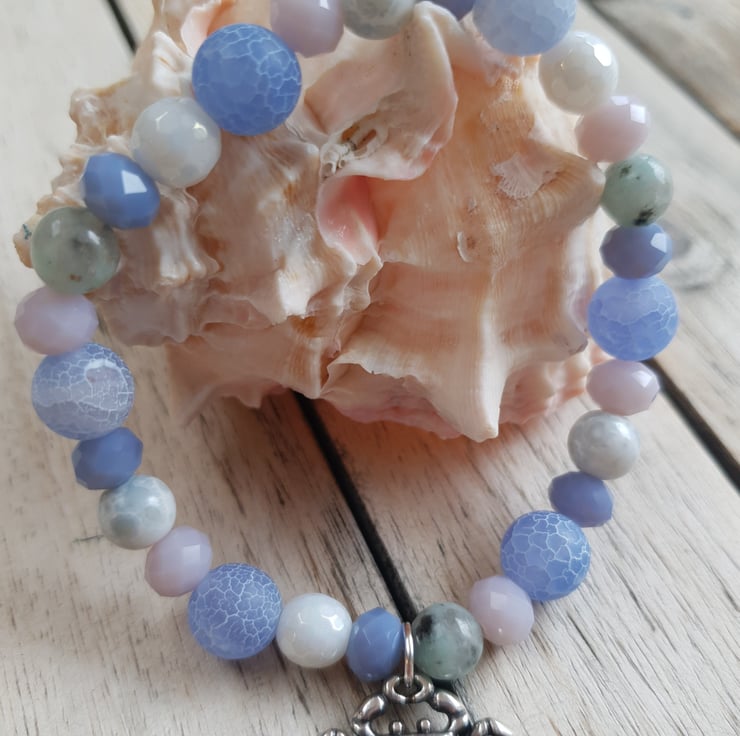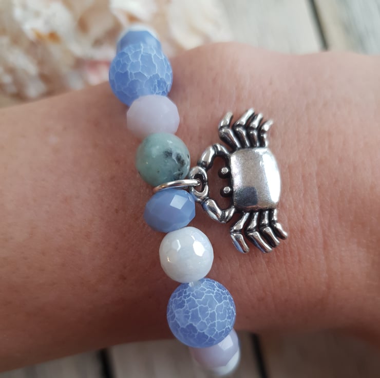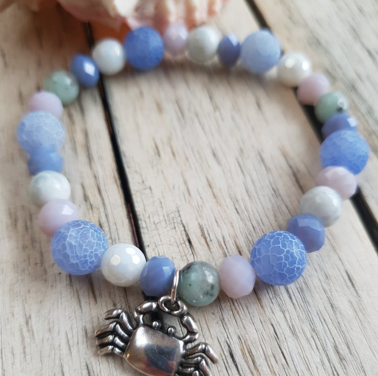 This bracelet is beautiful and will have you dreaming of the beach! Matt crackle effect blue agate beads are mixed with white marbled jade, green marbled jade, white faceted AB coated shimmer beads and sparkly faceted beads and finished with the cutest crab charm.