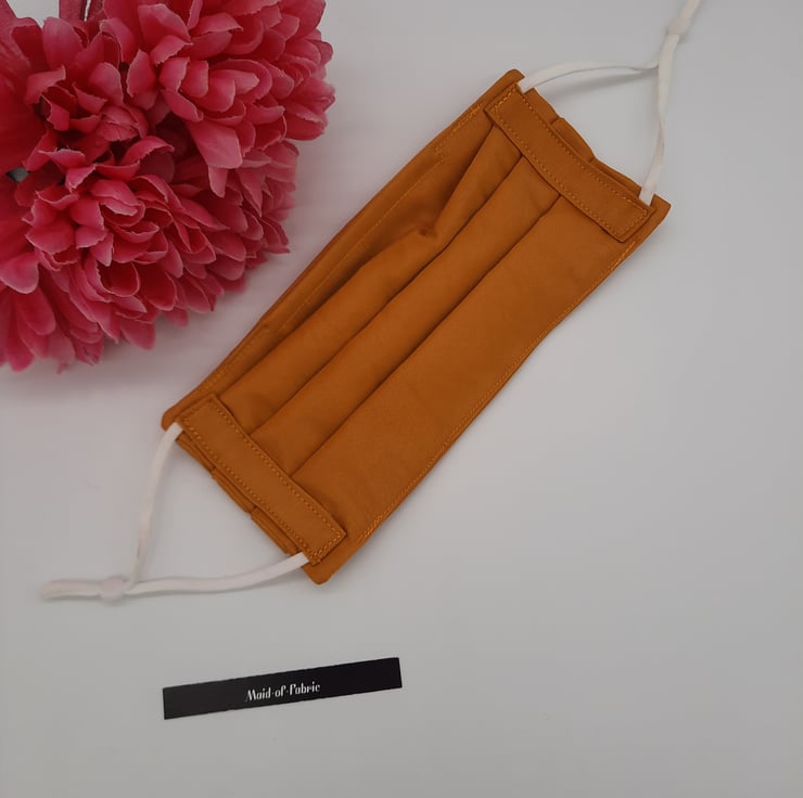 Face mask made using a gold satin fabric, adjustable soft white elastic and a 9cm flat bendable nose wire.