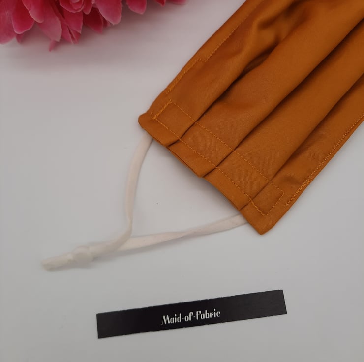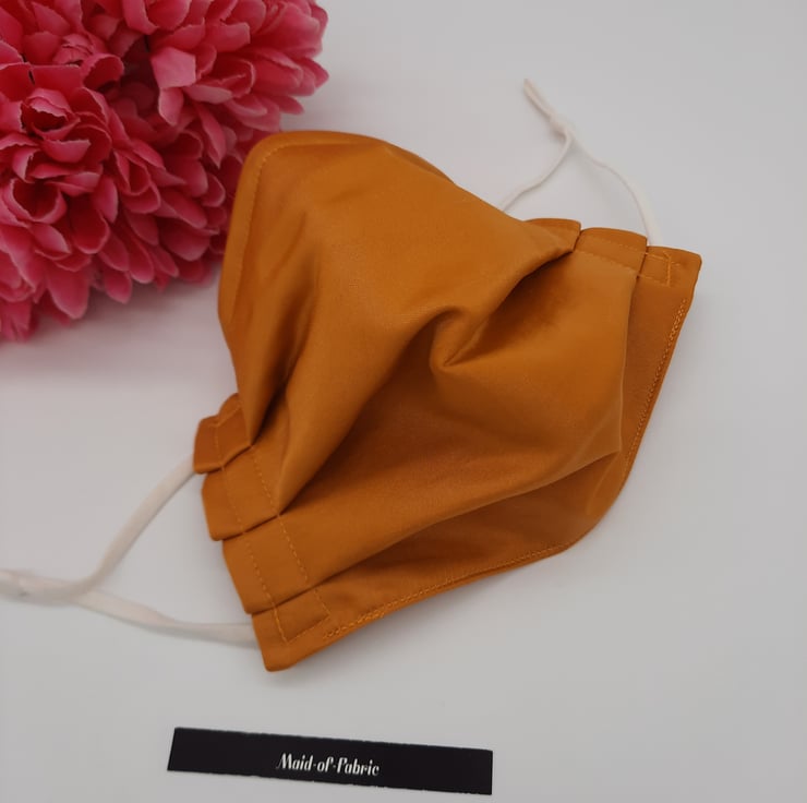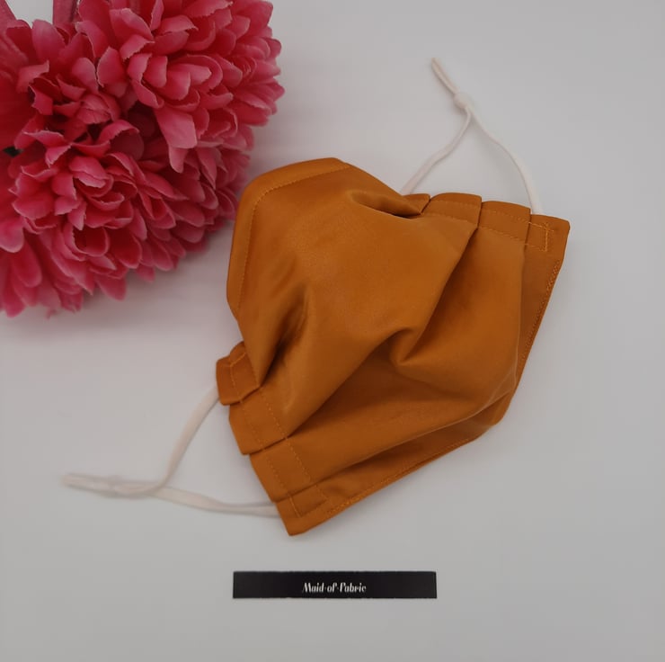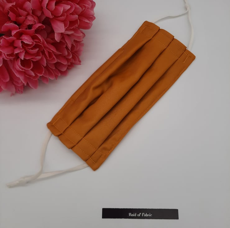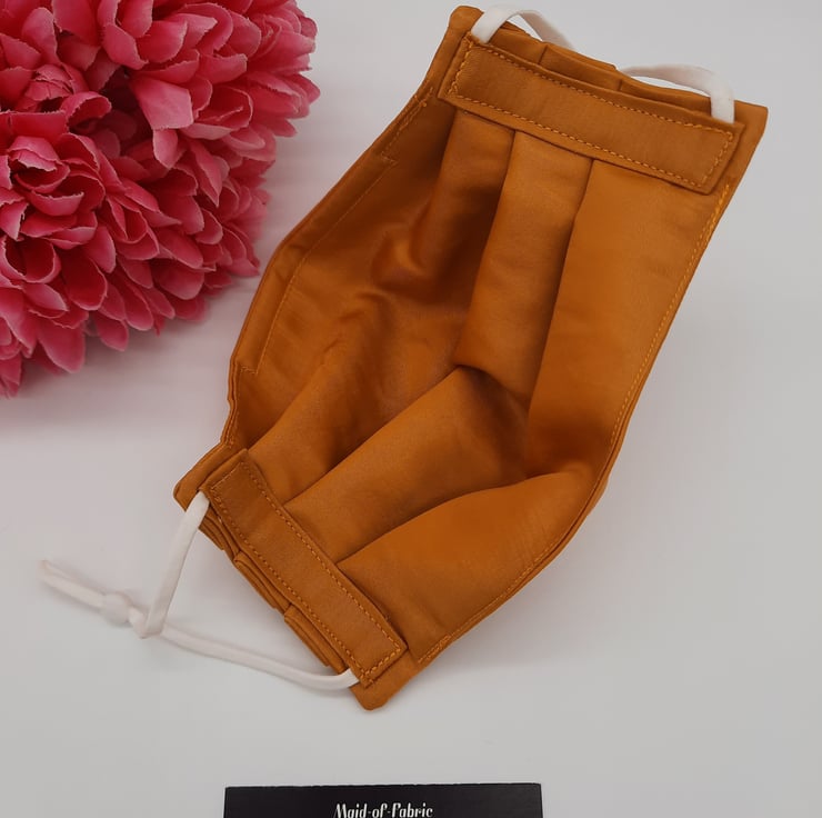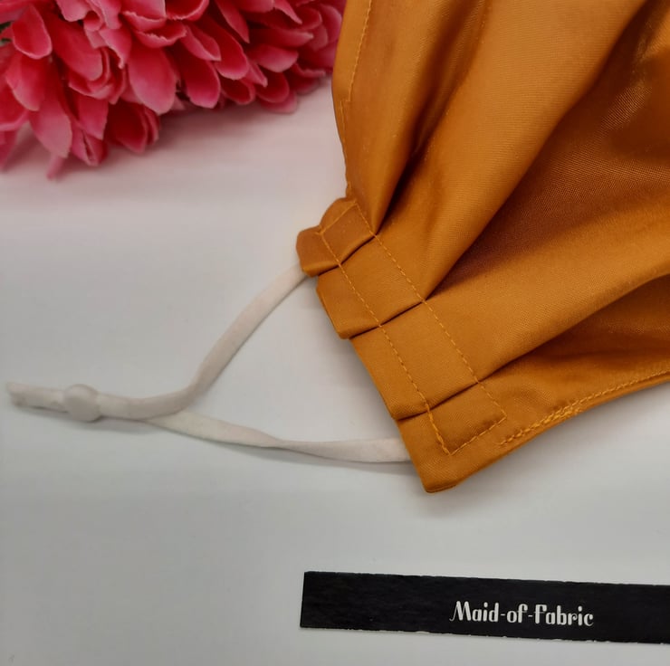 Face mask made using a gold satin fabric, soft white adjustable elastic and a 9cm bendable flat nose wire.
