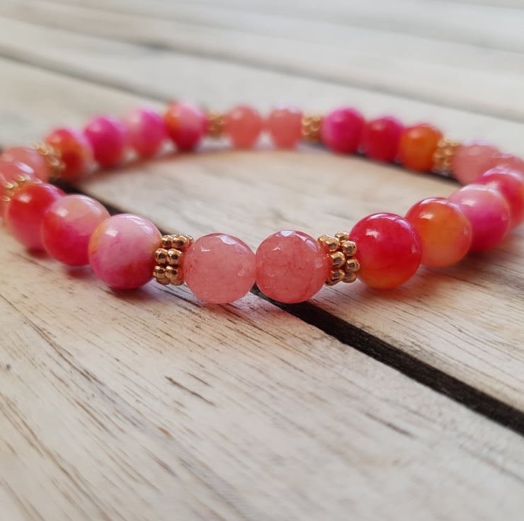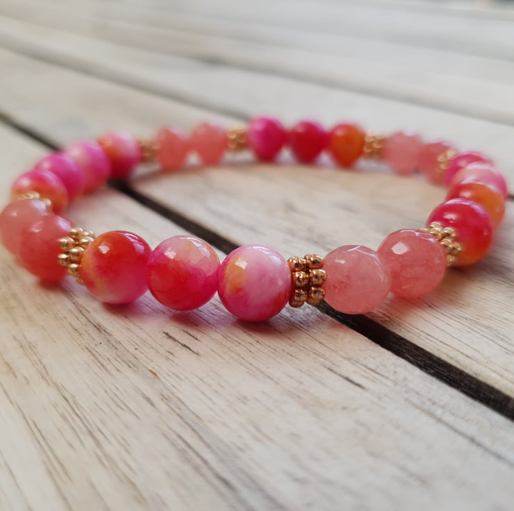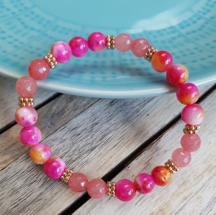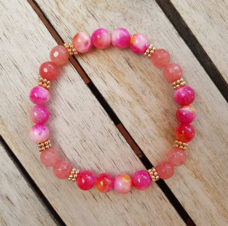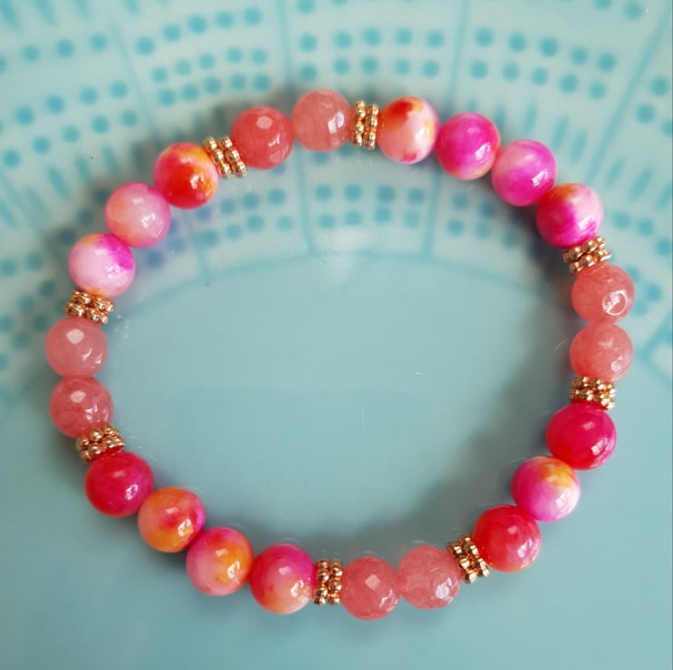 This is a stunning bracelet and has such a summery vibe! Beautiful tie dye effect jade beads and natural stone faceted beads are dotted with rose gold bead spacers for a truly tropical look.