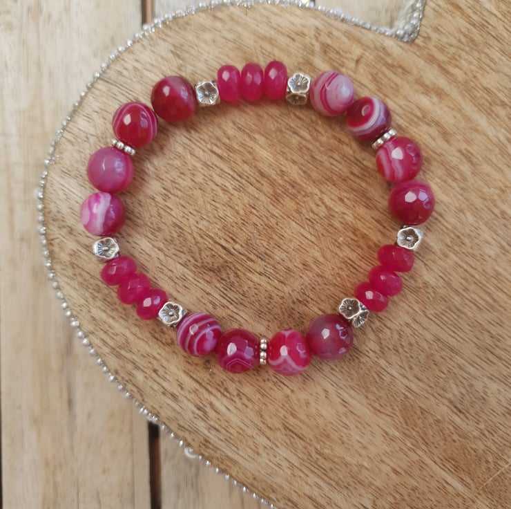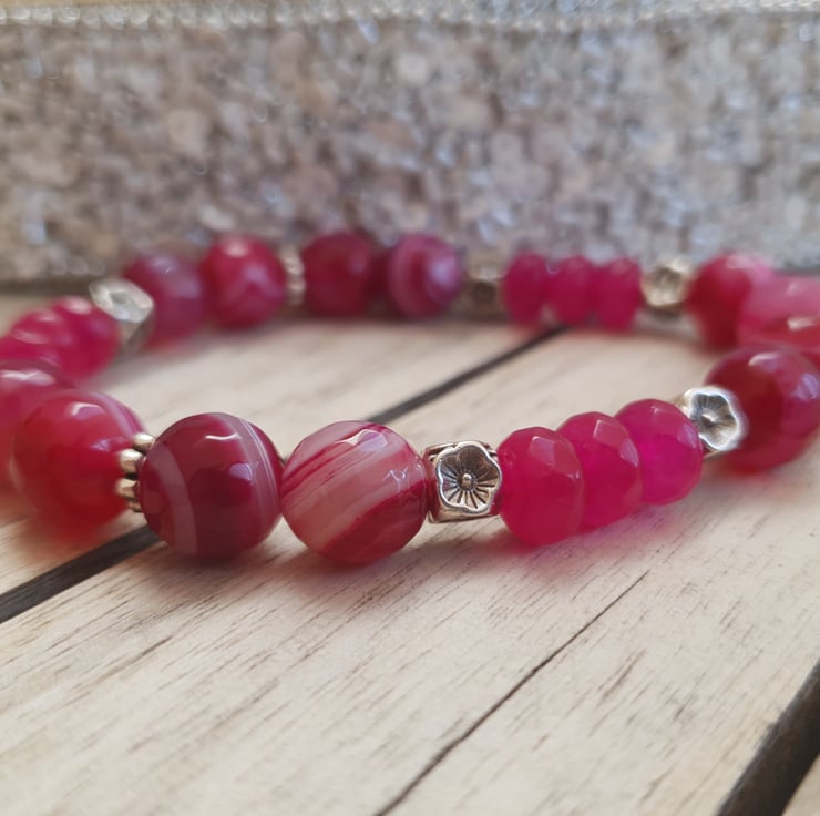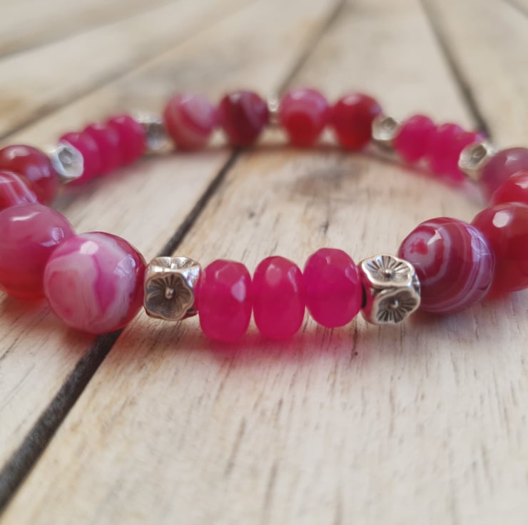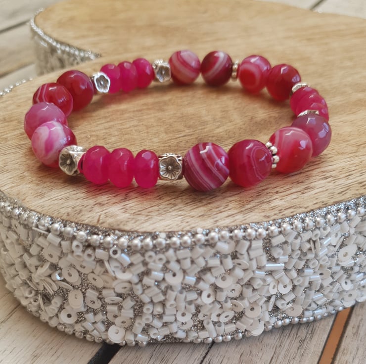 This bracelet is beautiful and is such a rich, deep pink - the pictures do not so this justice! The striped, faceted semi precious agate beads are so striking and each one is unique. The natural stone disc beads have the most subtle hint of glitter and are mesmerising to look at. Extra shine is added with gorgeous square floral embossed beads and tiny silver plated bead spacers.