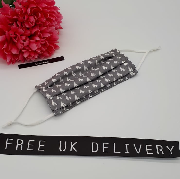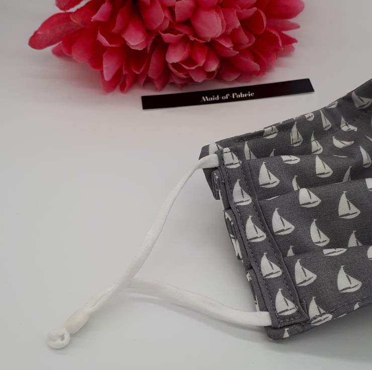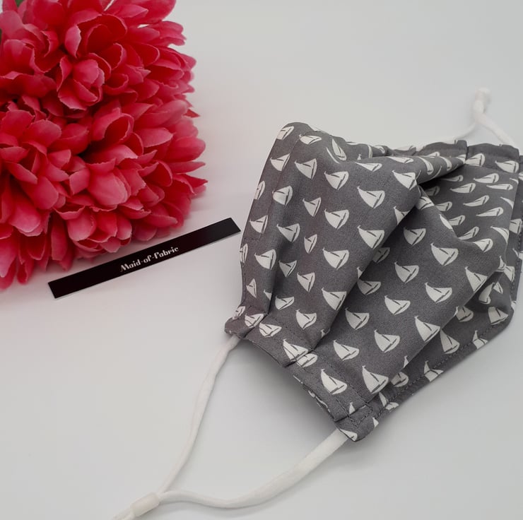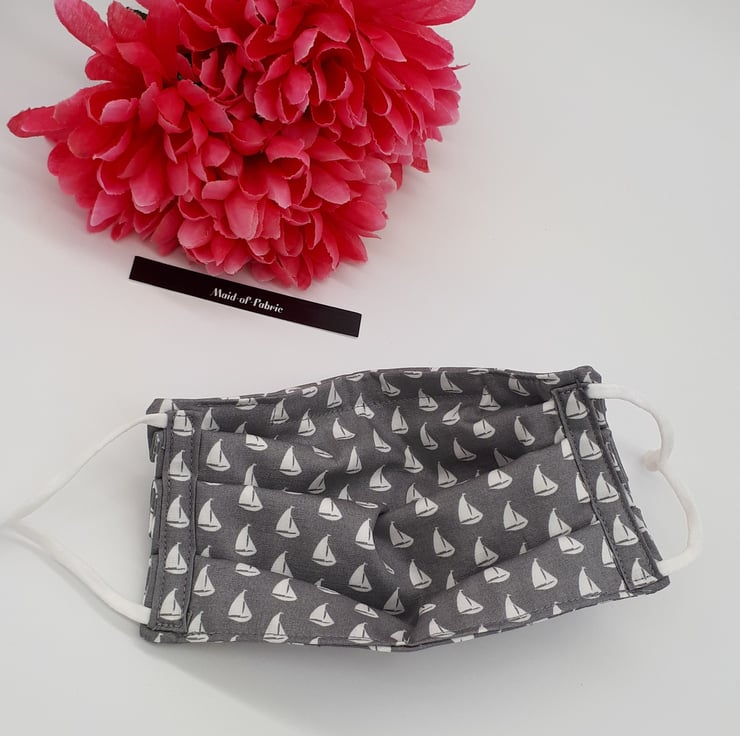 Face mask made using a soft grey and white sail boat print cotton fabric, adjustable soft white elastic and a 9cm flat bendable nose wire.