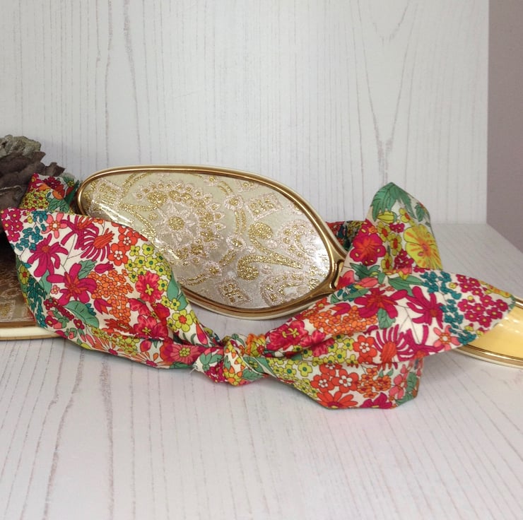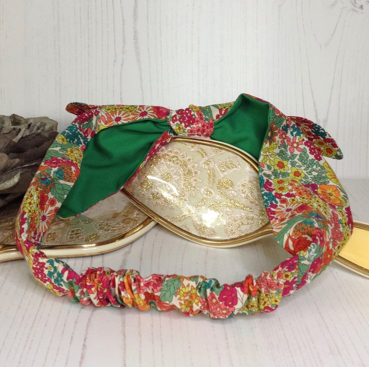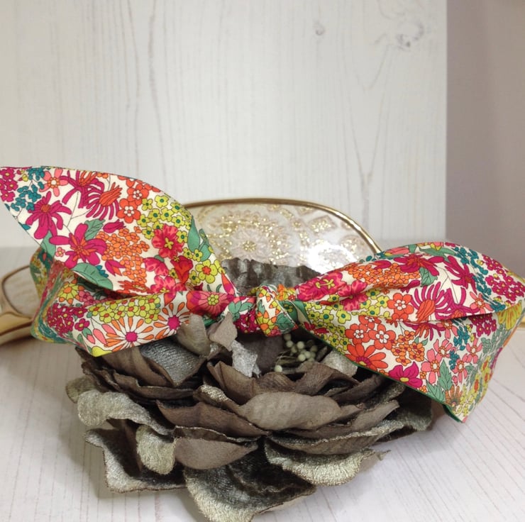Made in a quintessential Liberty Tana Lawn, in a vintage style with a bow on the top, soft elastic at the back. The band is lined with contrasting cotton fabric.