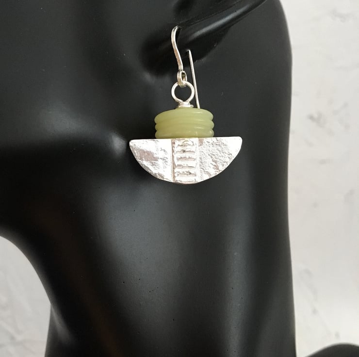 The silver blades have been fused and beaten for texture and a pattern has been punched . These are topped with a trio of lemon jasper disc beads.