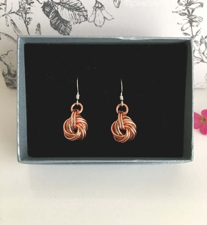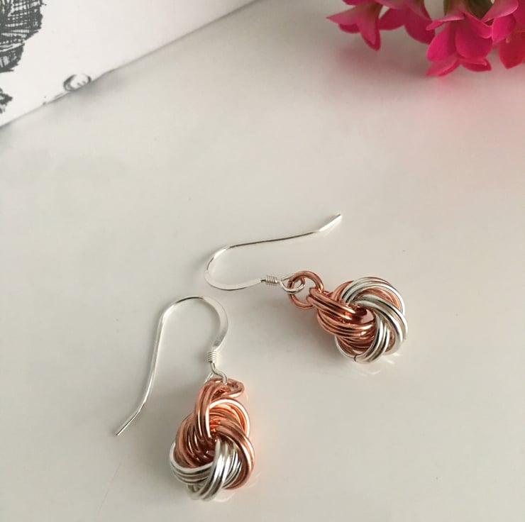 The danish knots have been handmade by creating mobius rings using several saw cut chainmail copper rings, and are suspended from sterling silver earwires.