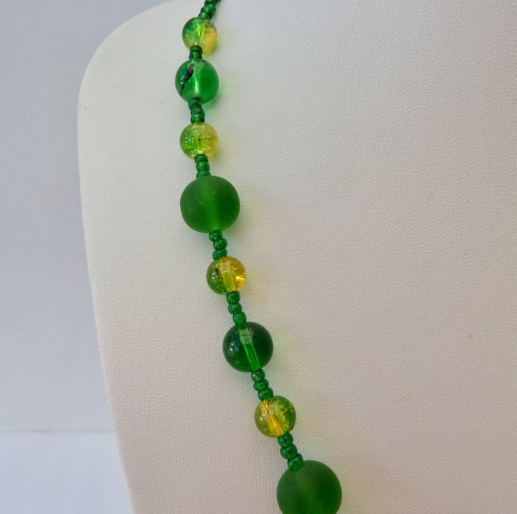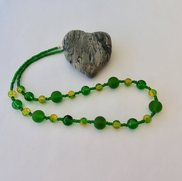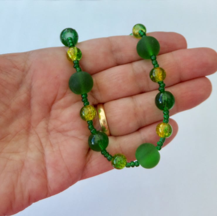 This necklace is made using mixed green glass beads that range from 12mm to 2mm, and include frosted, crackle and seed beads. The yellow/green crackle beads provide a glow and sparkle to enhance the green beads. The Necklace measures approx 21 inches and fastens with a silver coloured lobster clasp.
