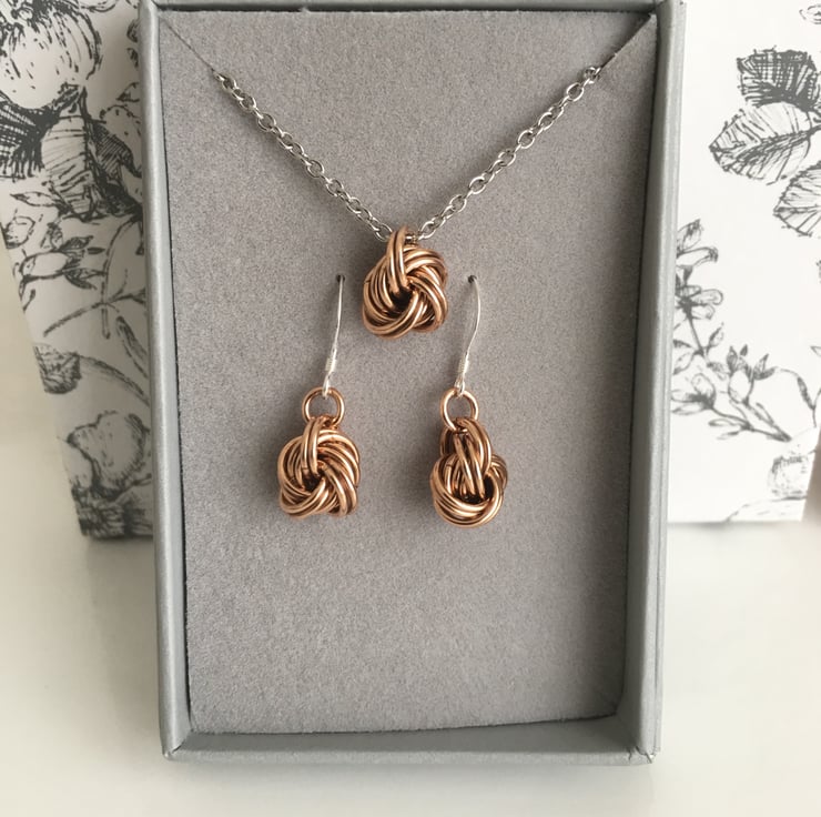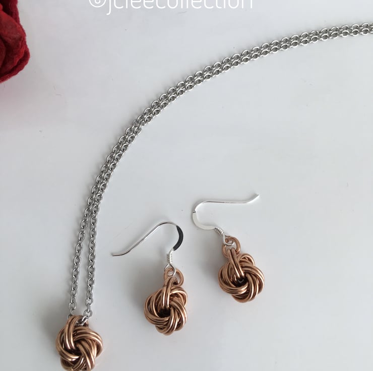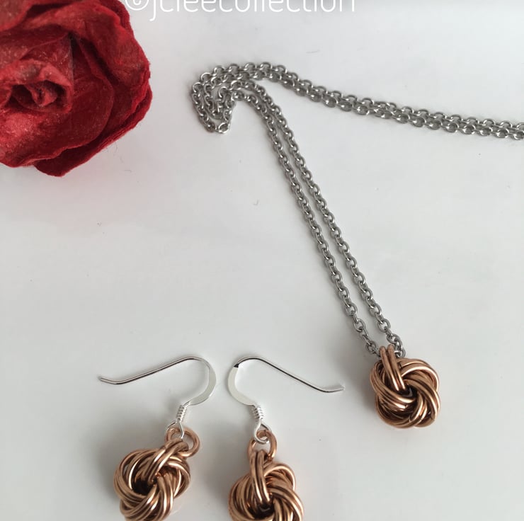 Handmade from pure bronze wire into infinity knot balls, which are handcrafted into a necklace and earrings set.