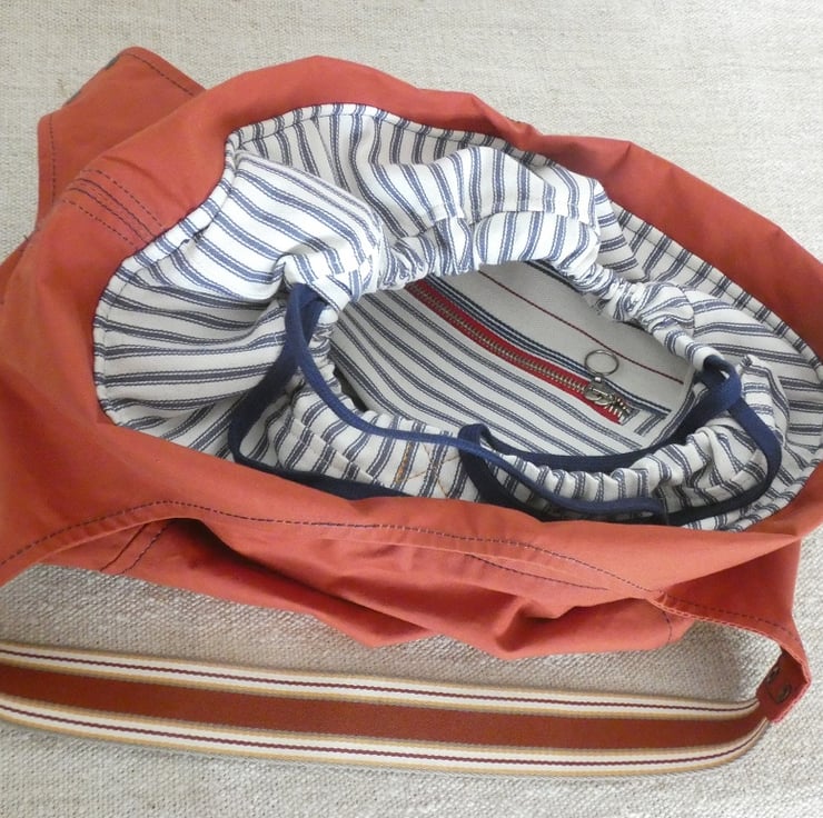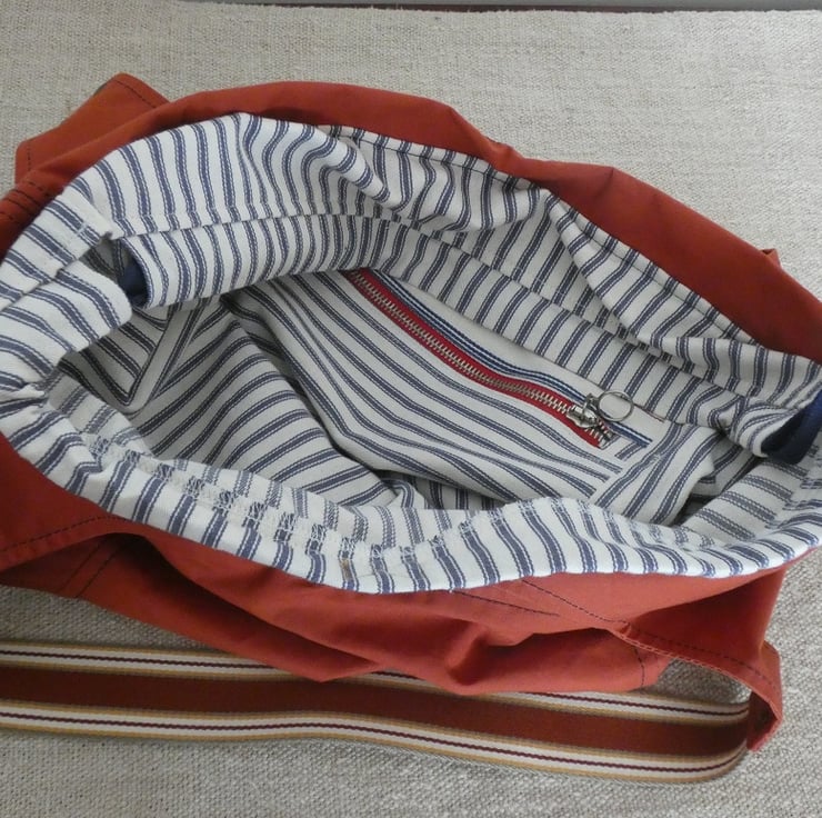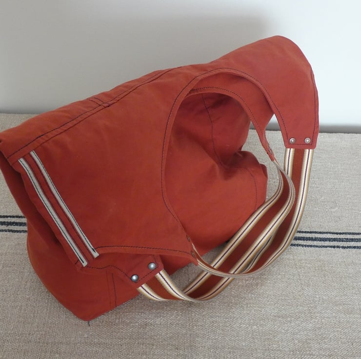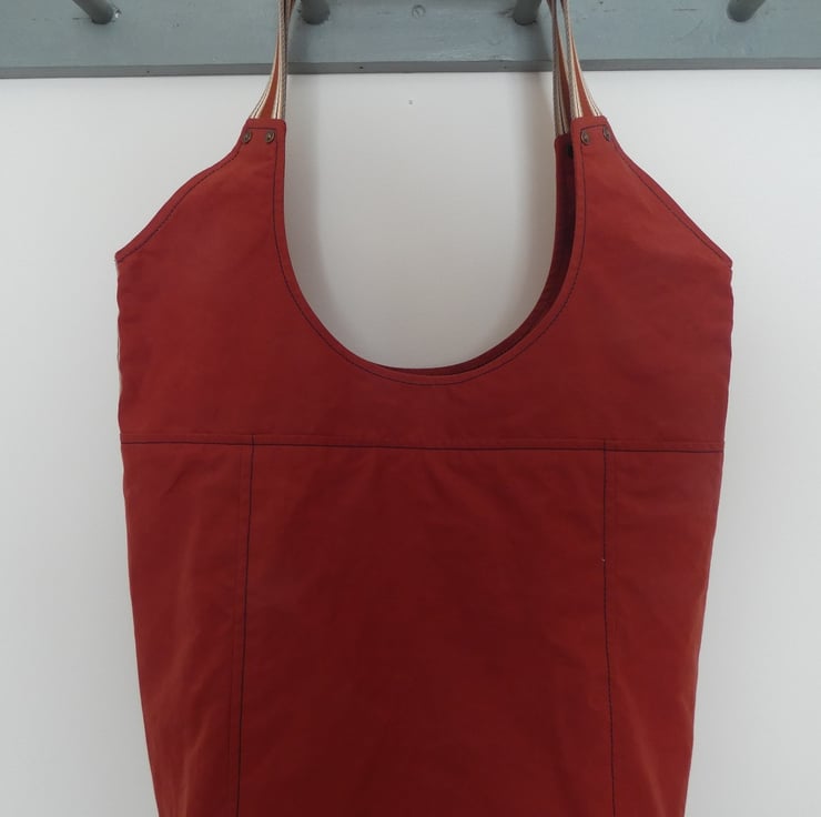 A stripped webbing for the handles, which are riveted to the bag for strength.