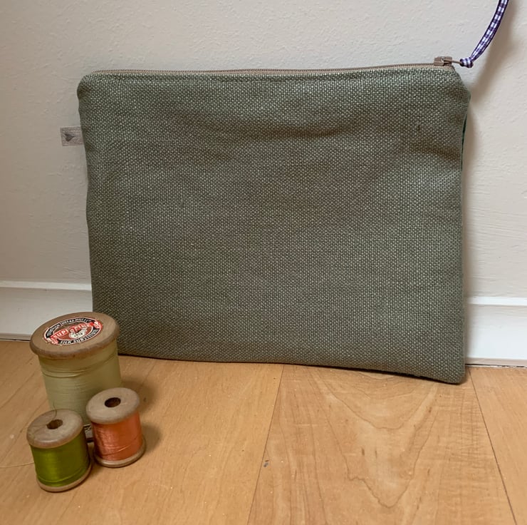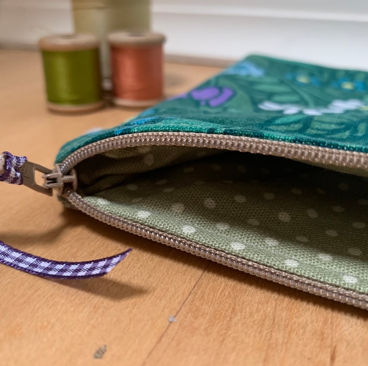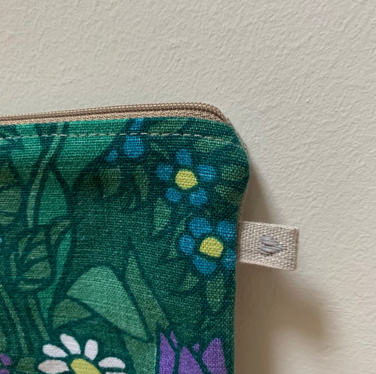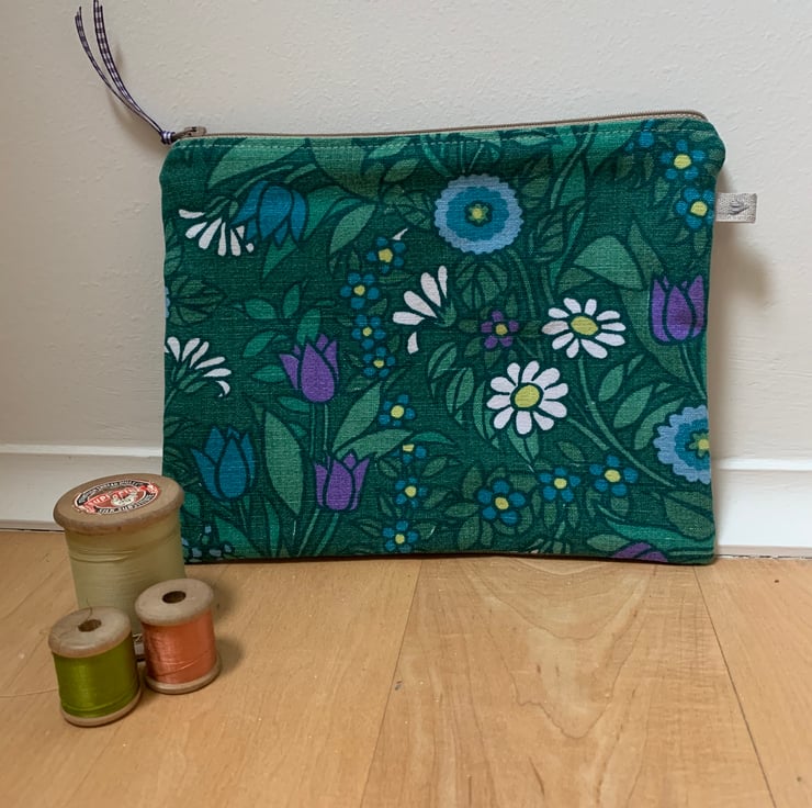 Zip pouch in green vintage Flower Waltz cotton designed by Pat Albeck in the 1960s/70s. The pouch is fully lined with green spotty cotton and backed with green linen.