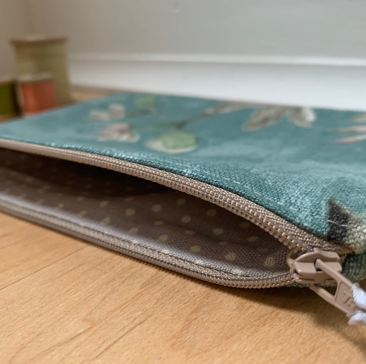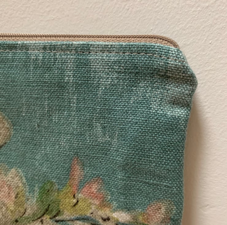 Beautiful zip pouch in vintage Sanderson floral screen printed linen. The pouch is fully lined with beige spotty cotton.