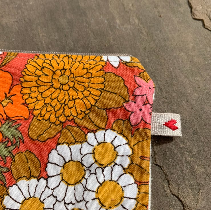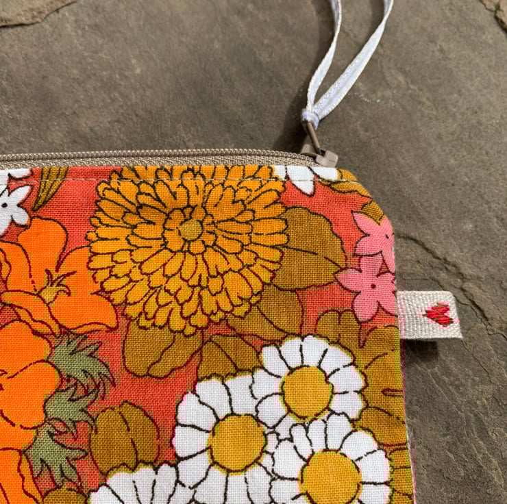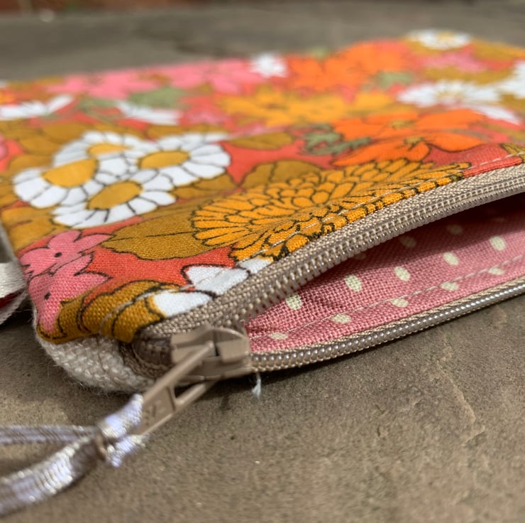 Beautiful zip pouch in vintage Sanderson Annabel cotton. The pouch is fully lined with pink spotty cotton.