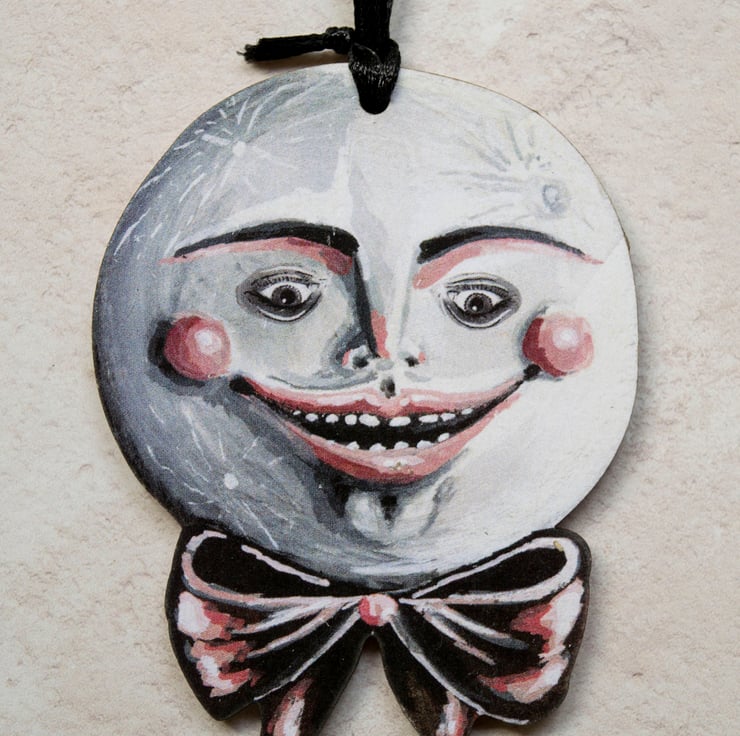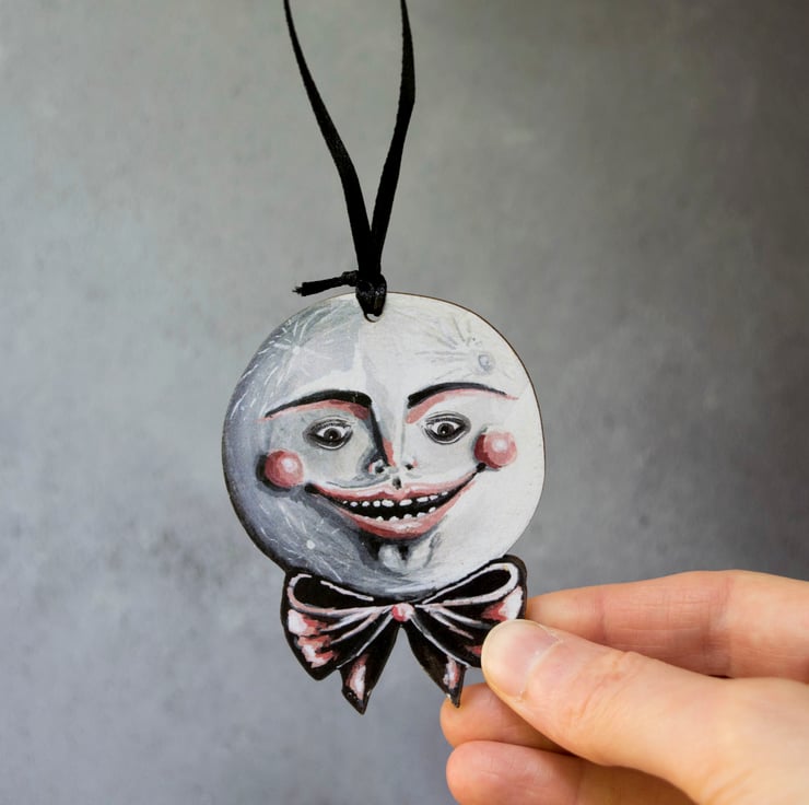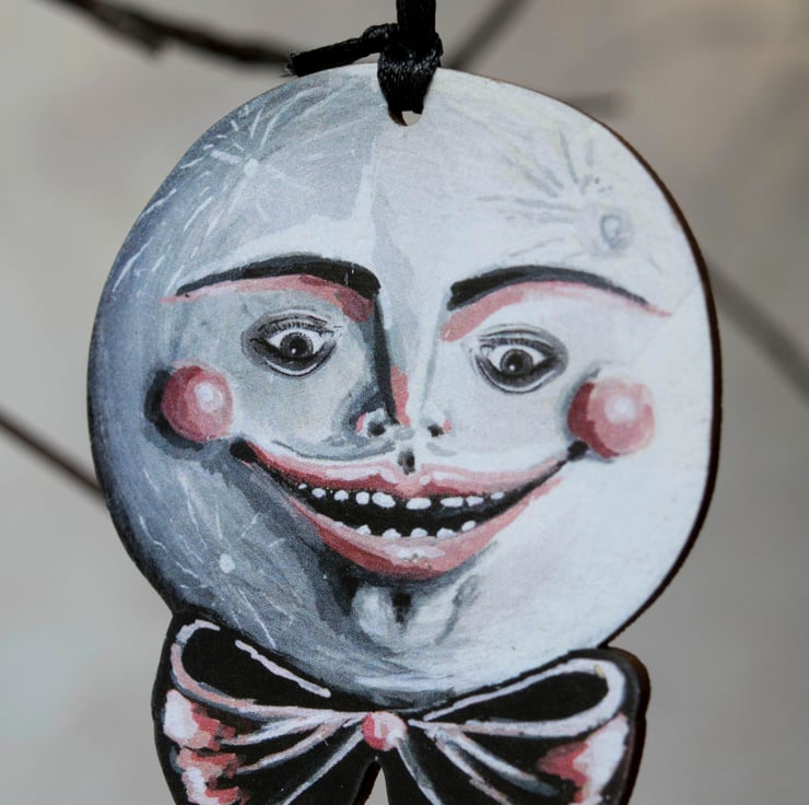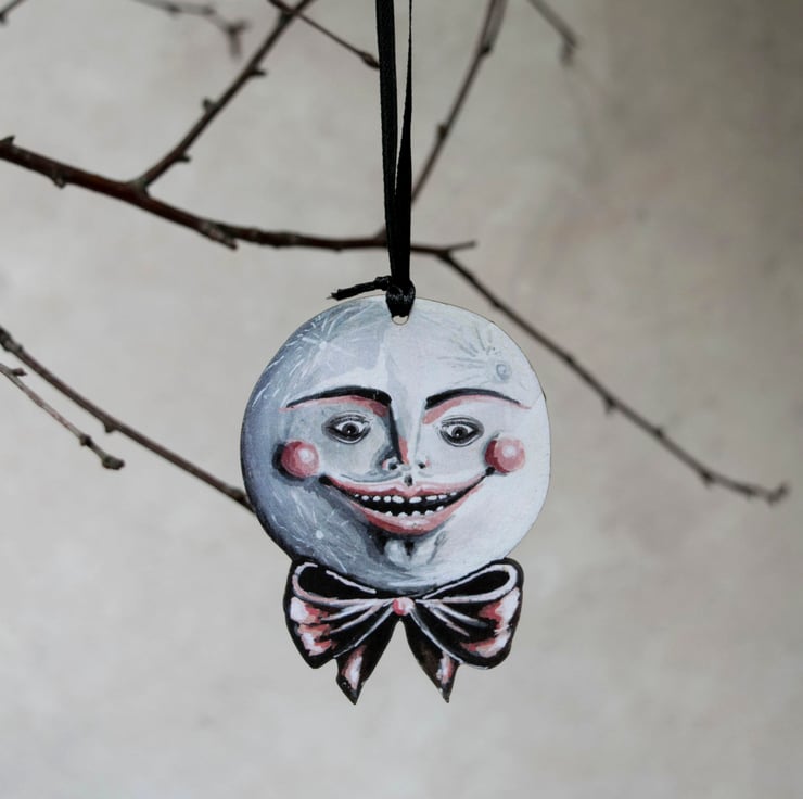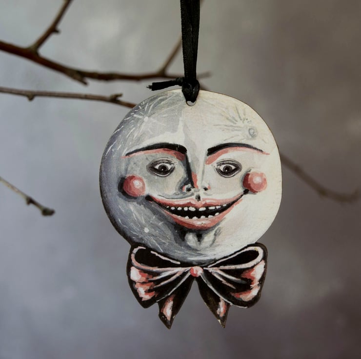 What a creepy fellow this is! It's Herman the moon, who is a wooden hanging decoration made especially for Halloween.