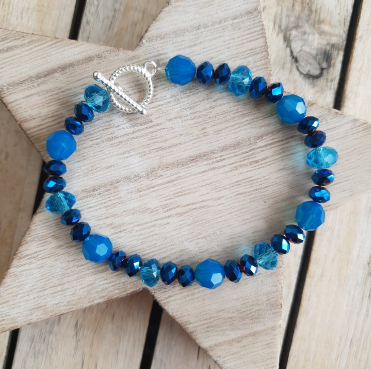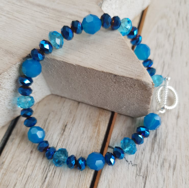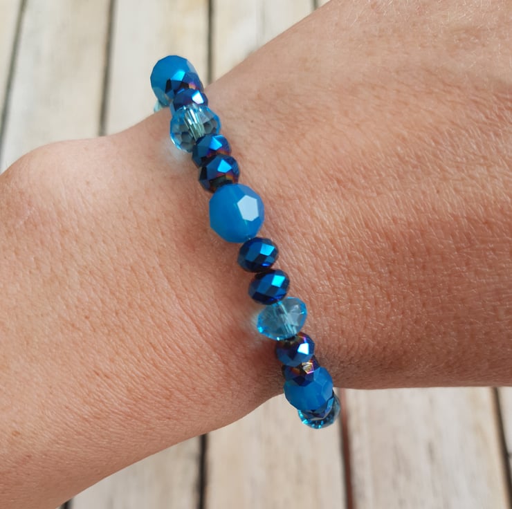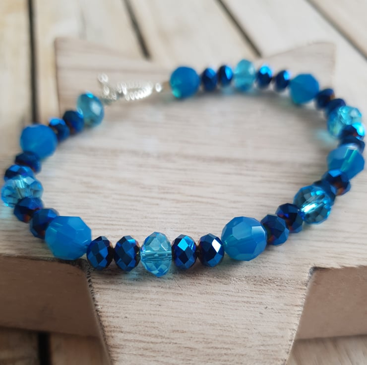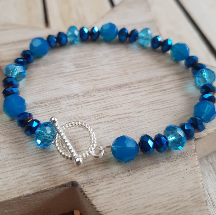 This is such an eye catching bracelet and really shines - if you like shimmer and sparkle then this one is definitely for you! A stunning mix of Swarovski turquoise opal beads, blue faceted beads and metallic look faceted beads.