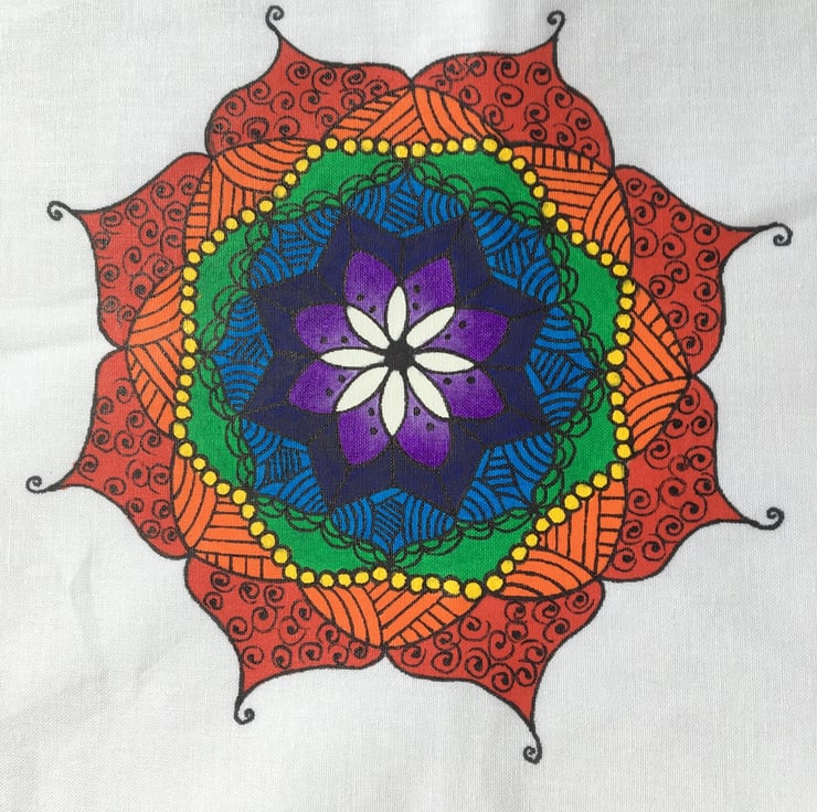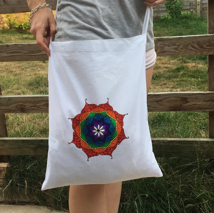 This is a hand drawn and hand painted tote bag, entirely designed by me. It features a mandala in rainbow colours.