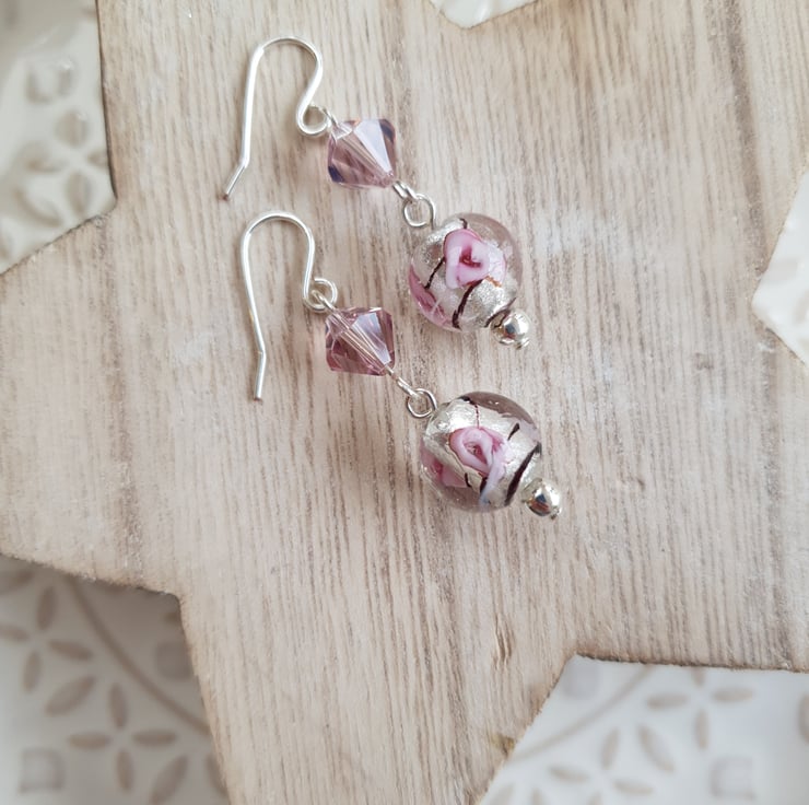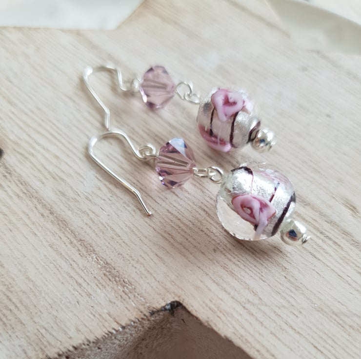 These are such pretty earrings! The star feature is a beautiful silver foil lampwrok glass bead adorned with pink swirls and delicate dark burgunday lines which sits on top of a silver plated 4mm bead. This is paired perfectly with an 8mm pink Swarovski Crystal bicone bead. The silver plated earring hooks are handmade in 0.8mm wire.