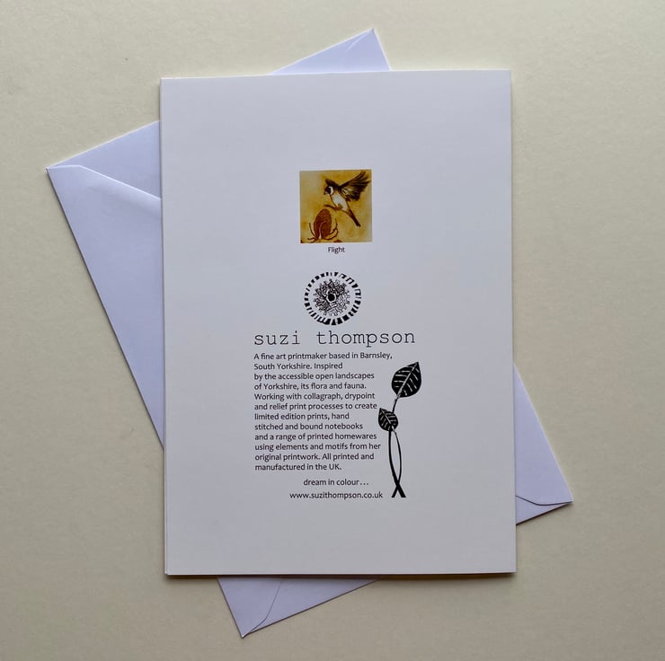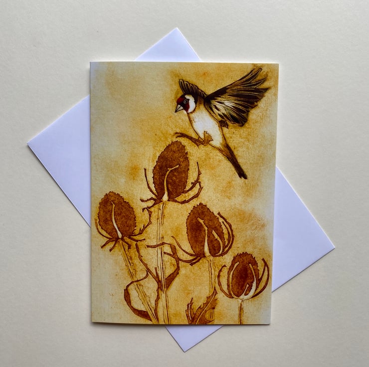 This card is taken from my original Collagraph print called Flight which captures this beautiful bird as he comes in to land on the head of a teasel to feed.