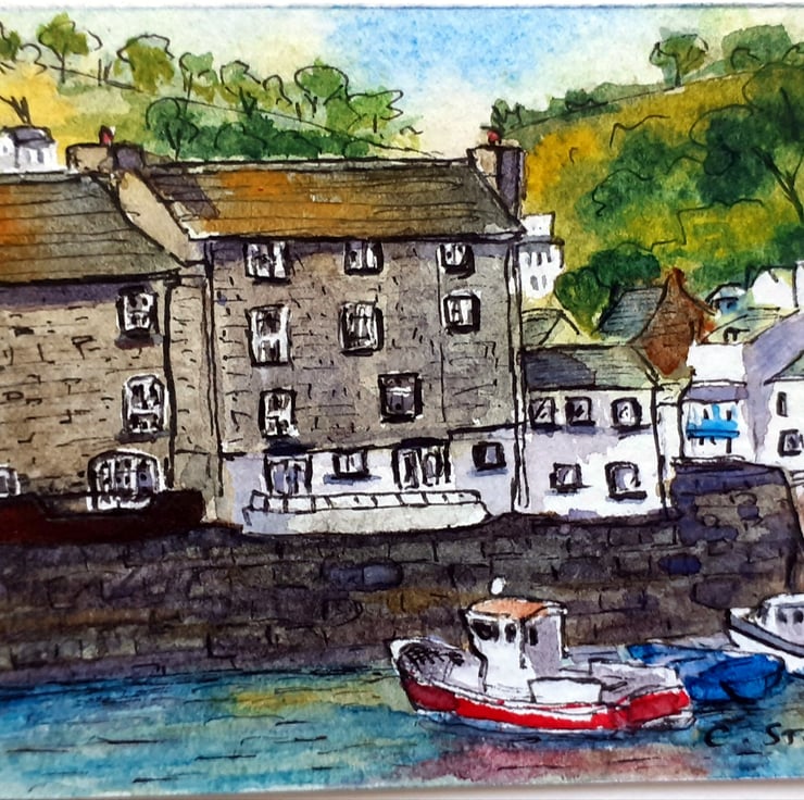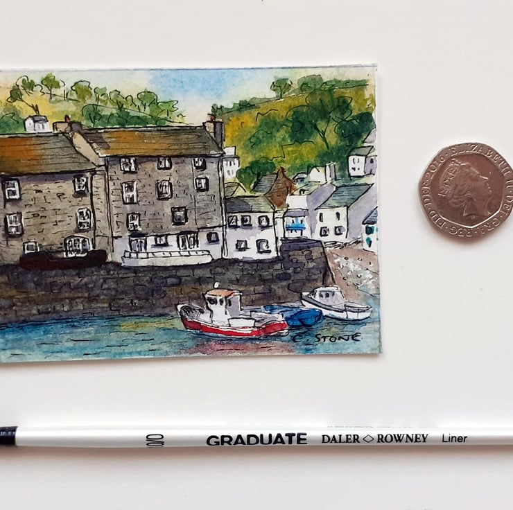 This is a miniature pen and watercolour painting of the harbour at Polperro, Cornwall, based on my own photograph.