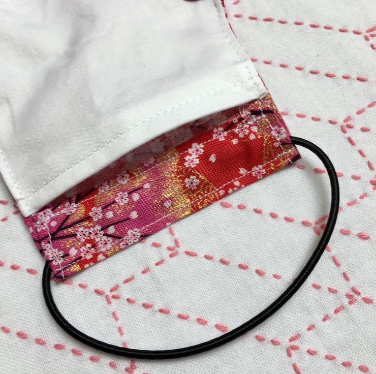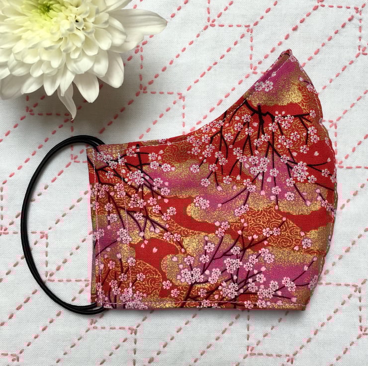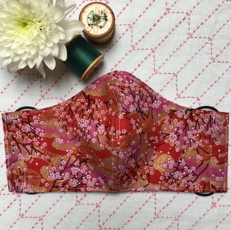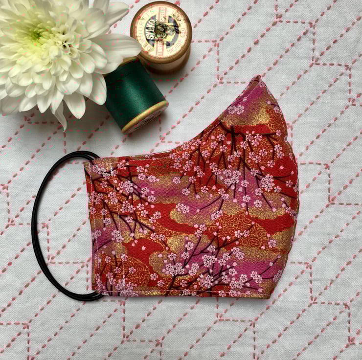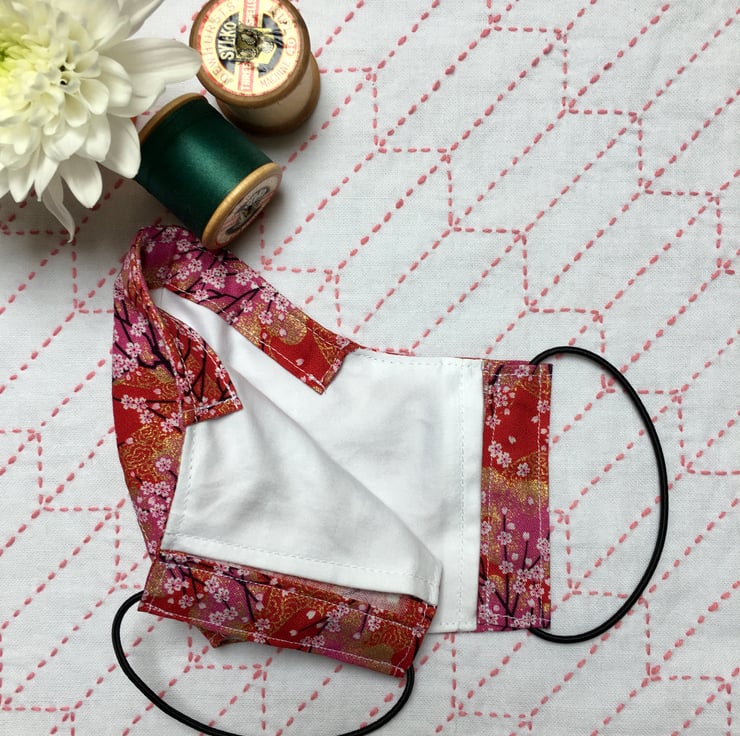 An exquisite blossoms Japanese fabric in cerise has been used to create this face mask. The mask is 100% cotton. The outer is a gilded high quality cotton and it is lined with at least a 400 thread count cotton, which is soft against the skin. The mask is washable & reusable.