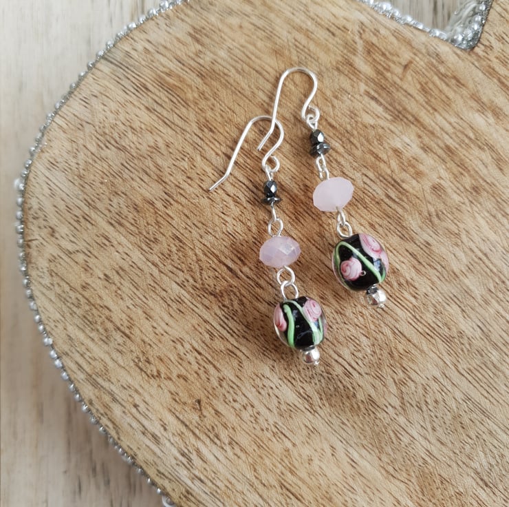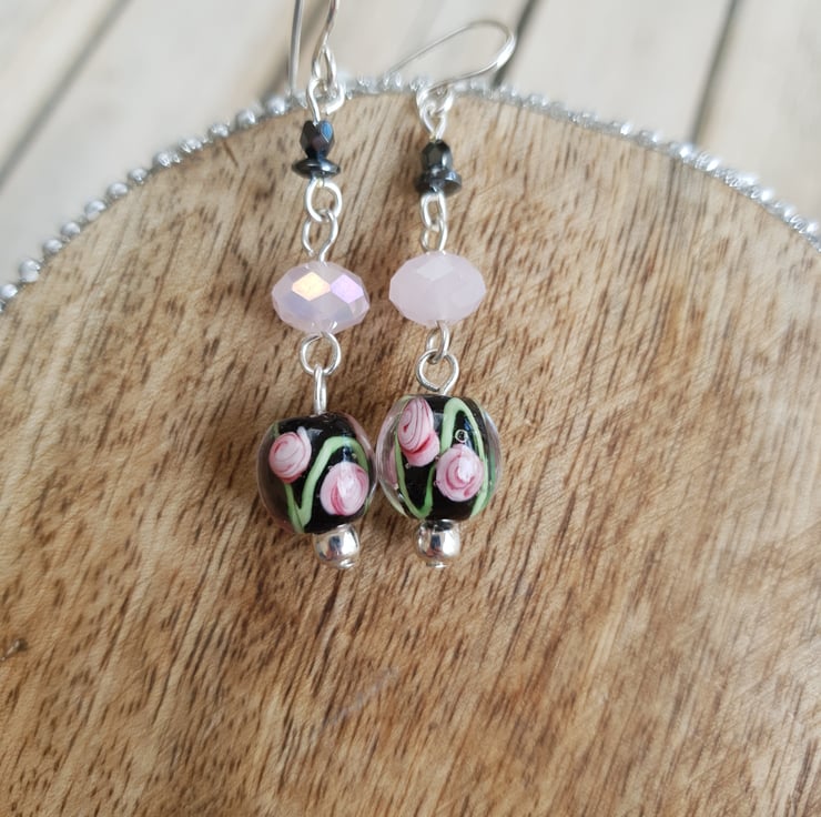 These are such pretty earrings! The star feature is a beautiful 10mm black lampwork glass bead adorned with pink and green floral swirls which sits on top of a silver plated 4mm bead. This is set off perfectly by a 6x8mm rose opal AB coated Swarovski Crystal bead which shimmers and shines when it catches the light. Further detail is added with two tiny black metallic beads. The silver plated earring hooks are handmade in 0.8mm wire.