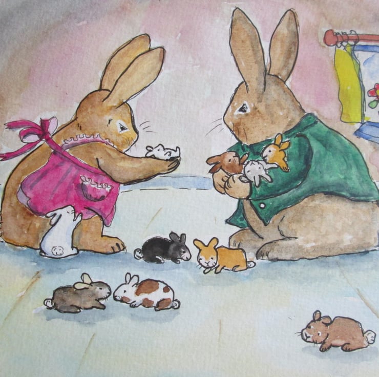 A cute illustration of a happy rabbit family . The parent rabbits admire their ten little ones.