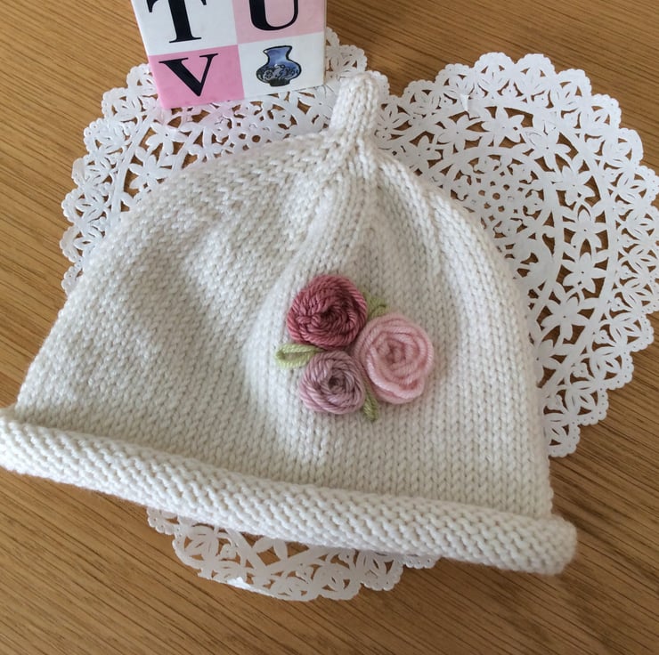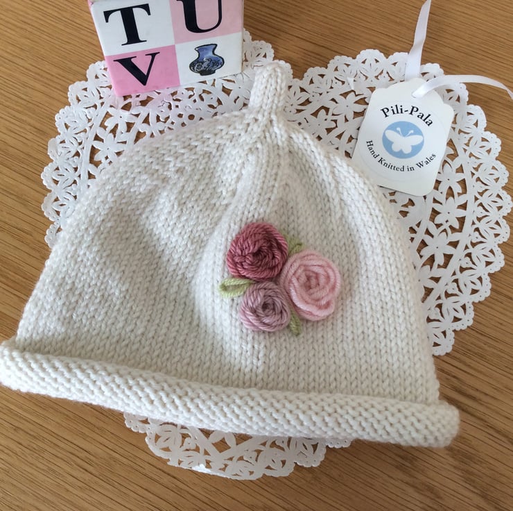 This soft little hat was hand knitted by me. It is knitted in a cashmere blend wool that is soft for babies but can also be machine washed at 30 degrees.