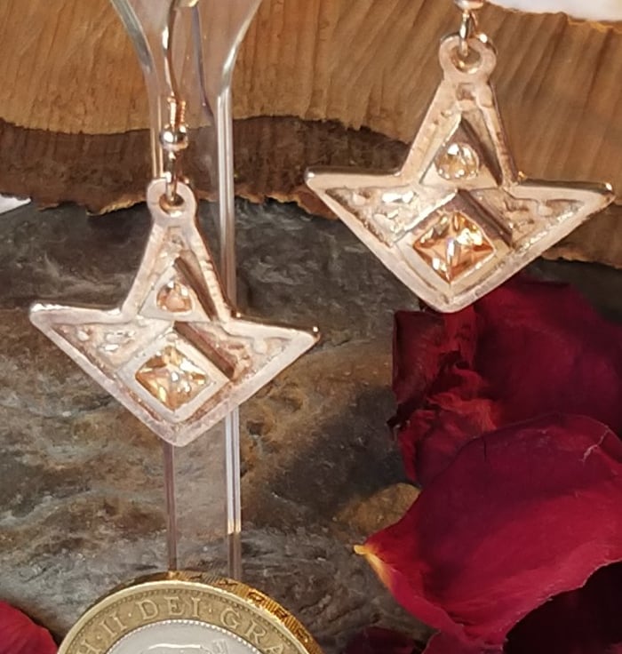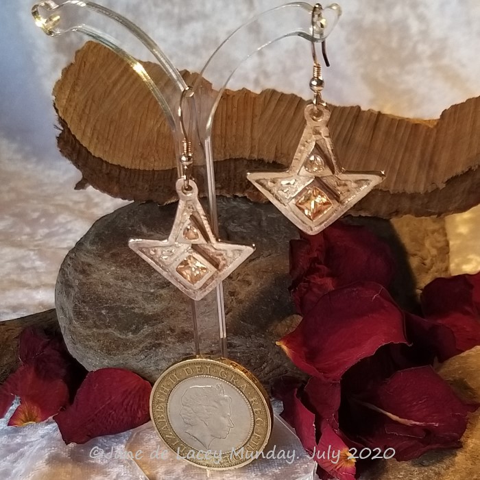 The design for these earrings was hand drawn by me with a view to it complementing a large statement piece pendant. Though a different shape to the pendant, they do go rather well with it. The pendant is still available and has the same coloured cubic zirconium stones.