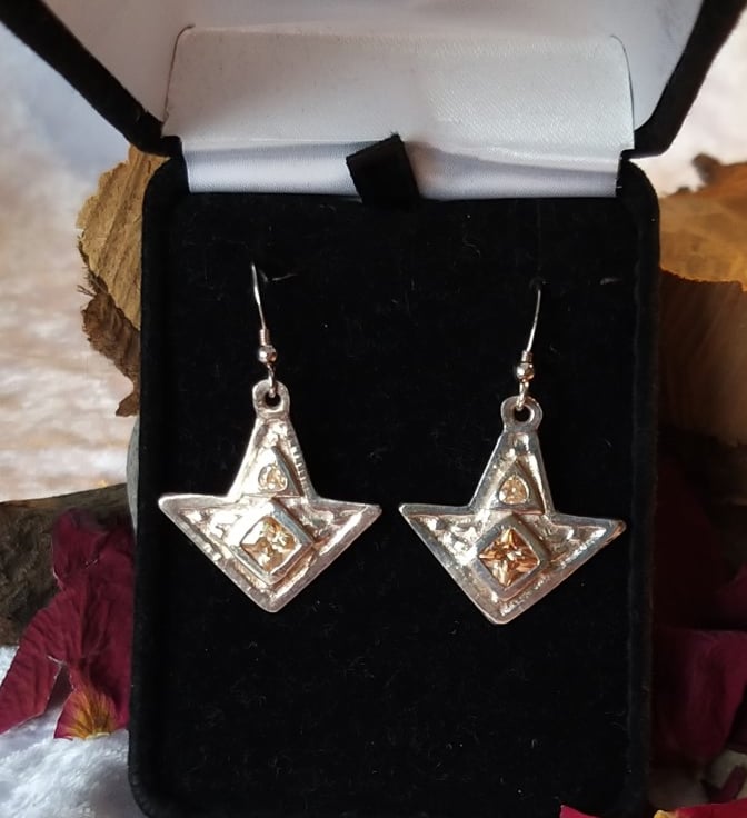Handcrafted f ine silver arrowhead style drop earrings with champagne cubic zirconium stones, on sterling silver earwires.