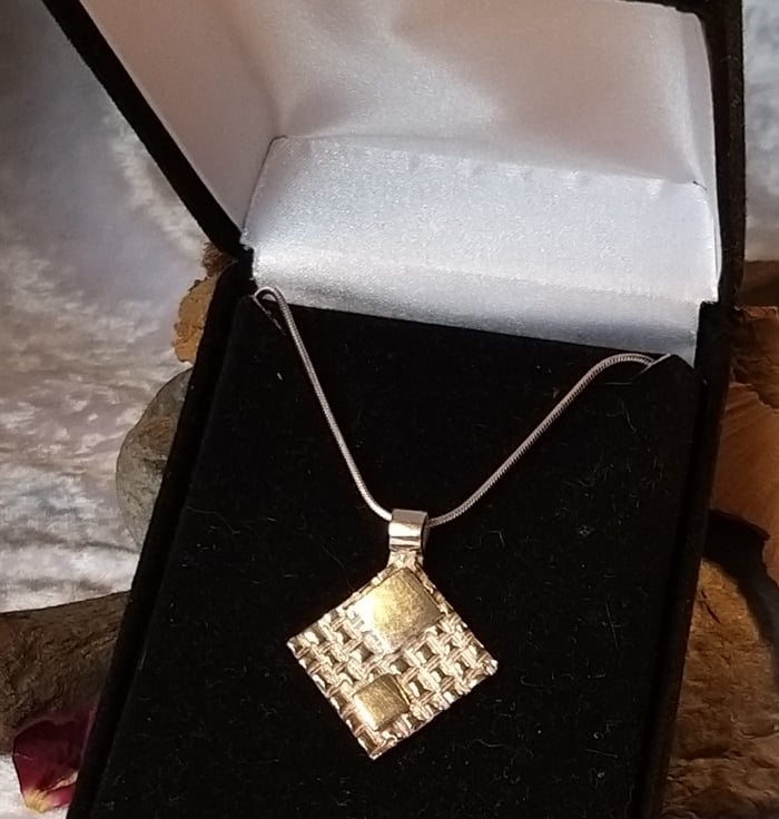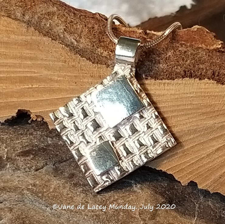 Handcrafted fine silver pendant with two diamond squares on a textured diamond shaped background. This pendant is on 18" Sterling Silver snake chain.