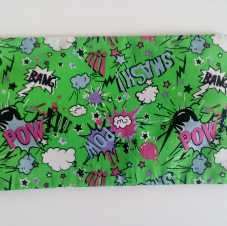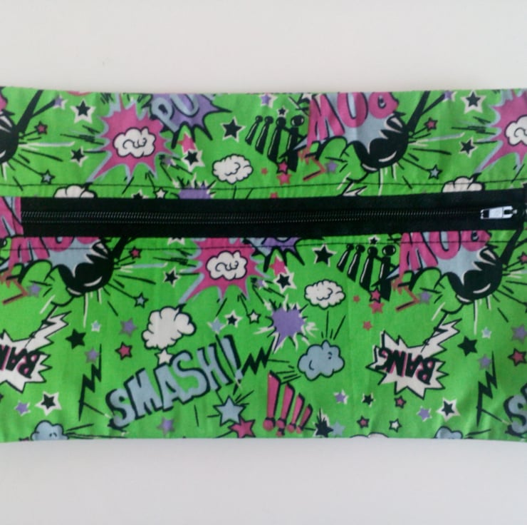 It measures approx 23cm x 13 cm with a zip front and fully lined with a green polycotton lining. Ideal for carrying all your pens & pencils.