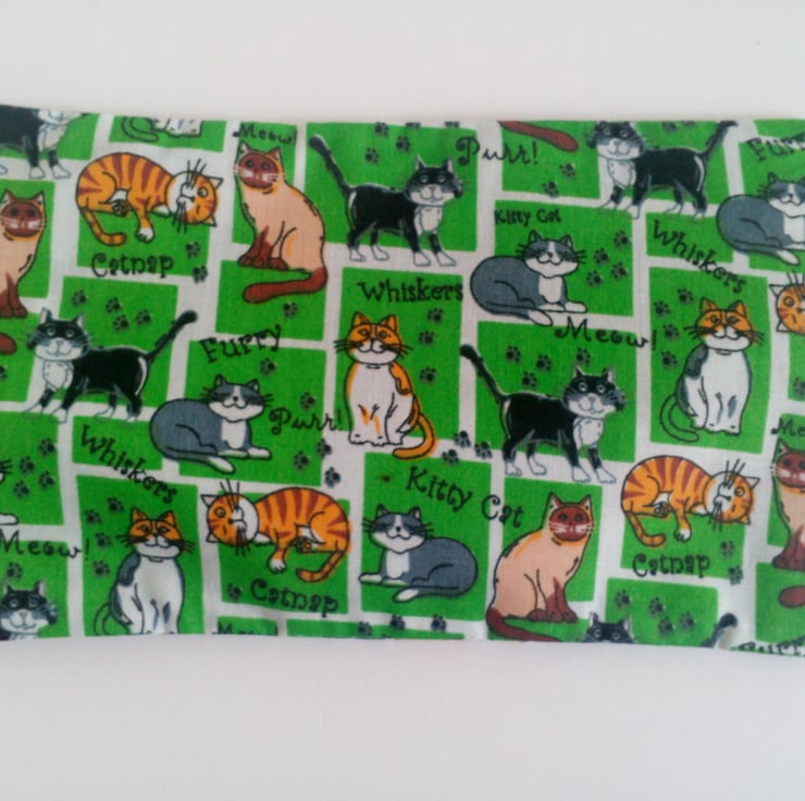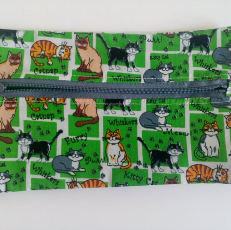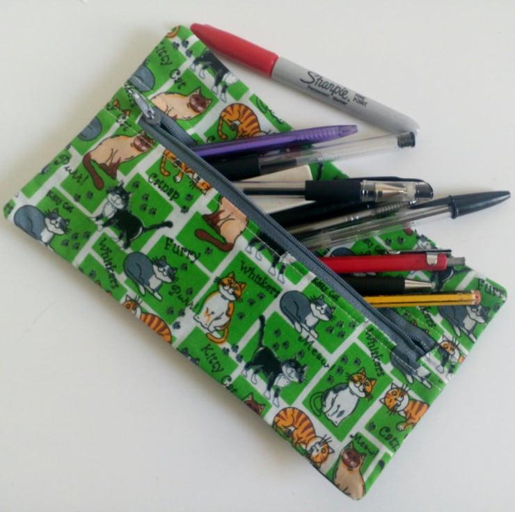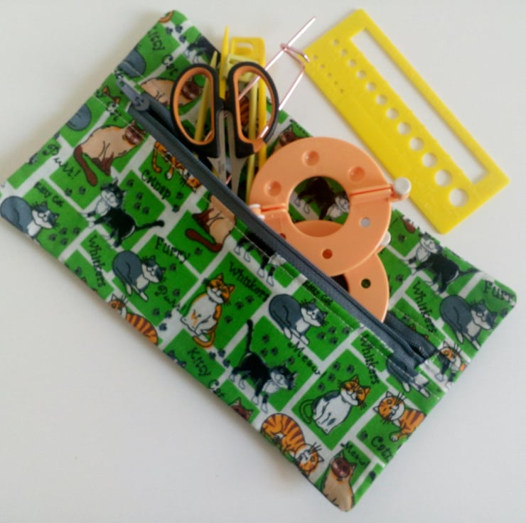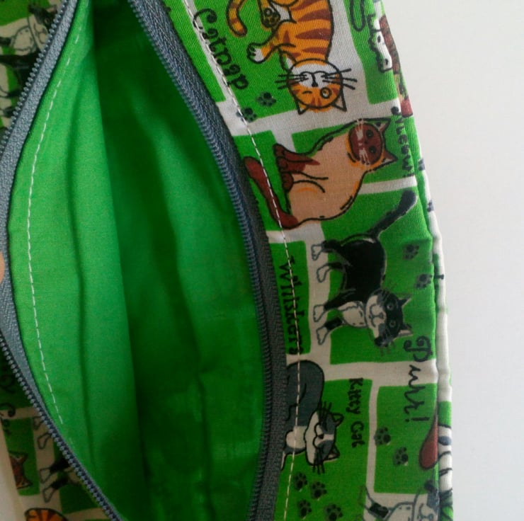 Green zipped polycotton pencil case with a cat design. It measures approx 23cm x 13cm with a front zip and fully lined with a green polycotton lining.