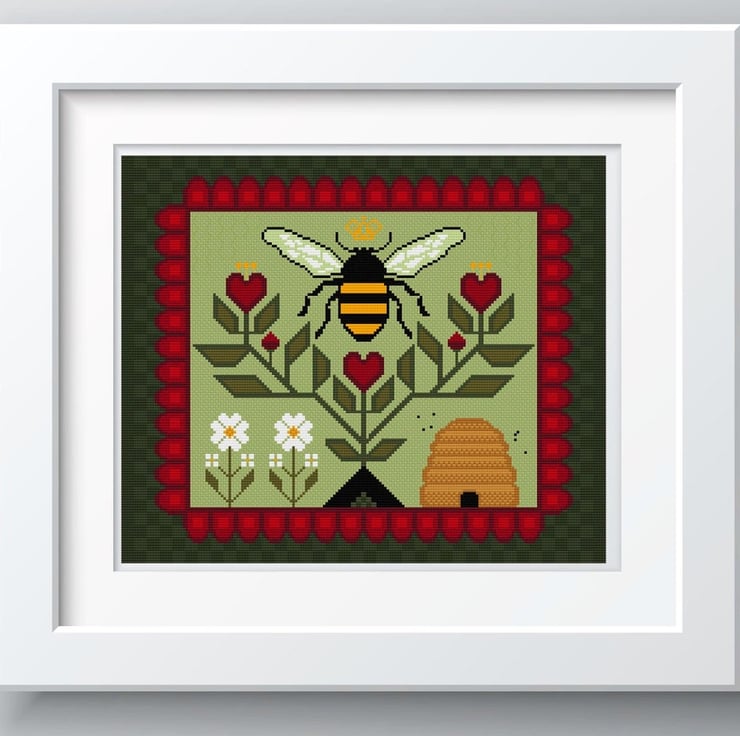 Cross stitch pattern 157 - Queen Bumble Bee - Early American Fractur Folk Art Quaker Style - PDF cross stitch/tapestry chart by Vivsters. No delivery costs - PDF file straight to your inbox. Start stitching straight today!