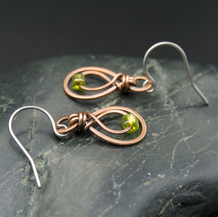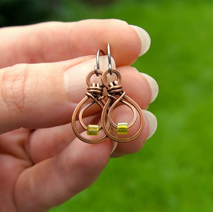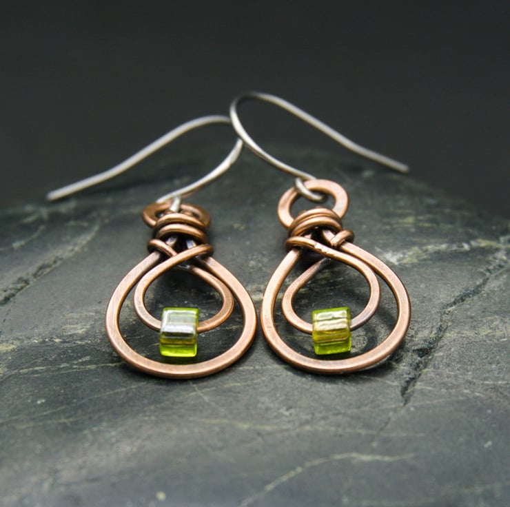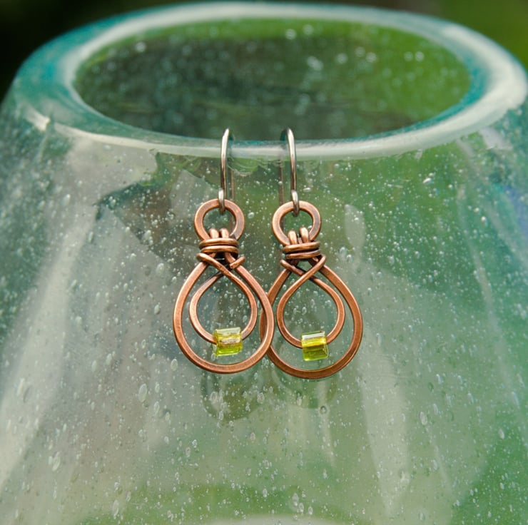 These pretty little earrings have been handmade from copper wire. A hammered teardrop shape has been formed from thicker wire & attached to a ring. The glass cube bead sits on a smaller teardrop made from finer wire, which has then been woven inside the larger shape. The beads are an olive green colour, which looks fab with copper.
