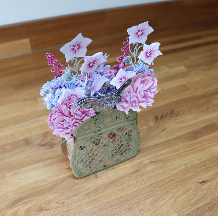 The Bird is a Eurasian Wren, Flowers are Agapanthus, Peony, Night-Scented Stock, Balloon Flower, Astilbe, some flowers are decoupaged as well as the Wren.