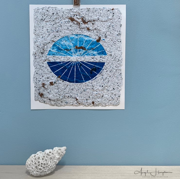 Printing with a lino cut onto this heavily textured hand made paper gave very interesting and surprising results. I removed some of the fibre and these became clouds. It reminds me of open seaside vistas.