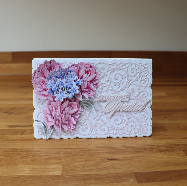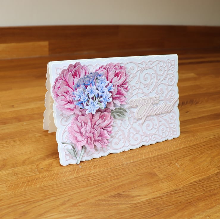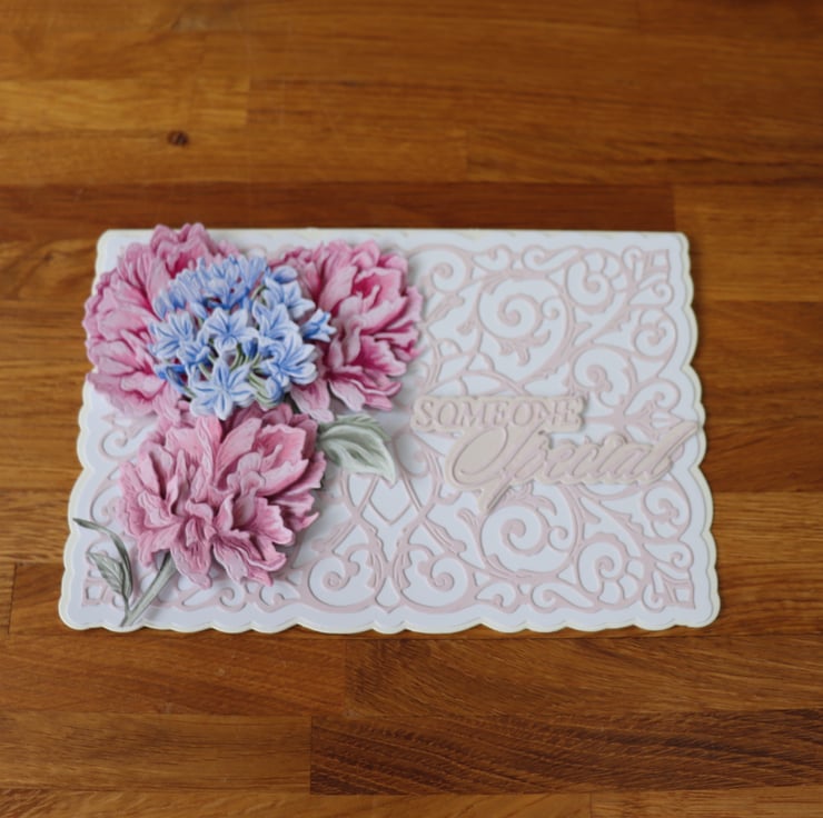 The Pink and Blue Decoupaged Flowers are set on a Pastel pink Lattice frame, this card has Decorative Edges.