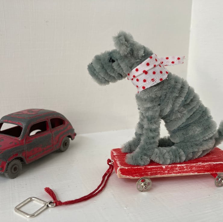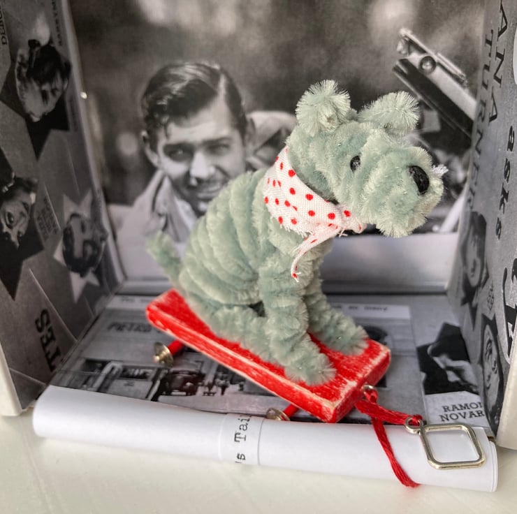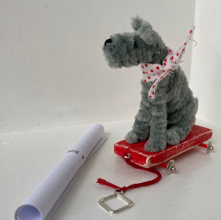 OOAK sculptured miniature dog on a pull along wooden trolley with wheels. All my animals are hand finished with eyes and noses and ,if needed, wool whiskers! The wheels are for decorative purposes only and do not turn. My animals are not toys but are designed as small pieces of art for display on a shelf - somewhere where they will be admired and loved. Each little guy or gal will come boxed and with a little story about their past exploits!