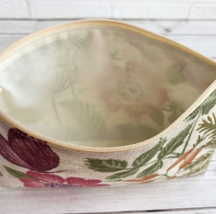 A lovely make up bag made from a pretty floral print fabric. The pattern features pink flowers with purple centres, alongside green foliage and burnt orange seed pods. There is a purple butterfly sitting on one of the flowers. The shades of the pattern look lovely against the cream background of the fabric. The cosmetic bag fastens with a cream zip and is lined with cream fabric. The base of the bag is boxed giving lots of room inside.