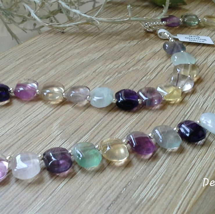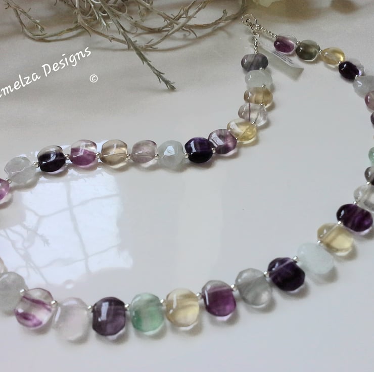 An unusually dainty looking necklace designed and hand crafted in Cornwall using exceptional quality top drilled pillow cut rainbow flourite gemstones. Between each one are 2mm sterling silver spacer beads adding a classical look with touch of sparkle during wear.