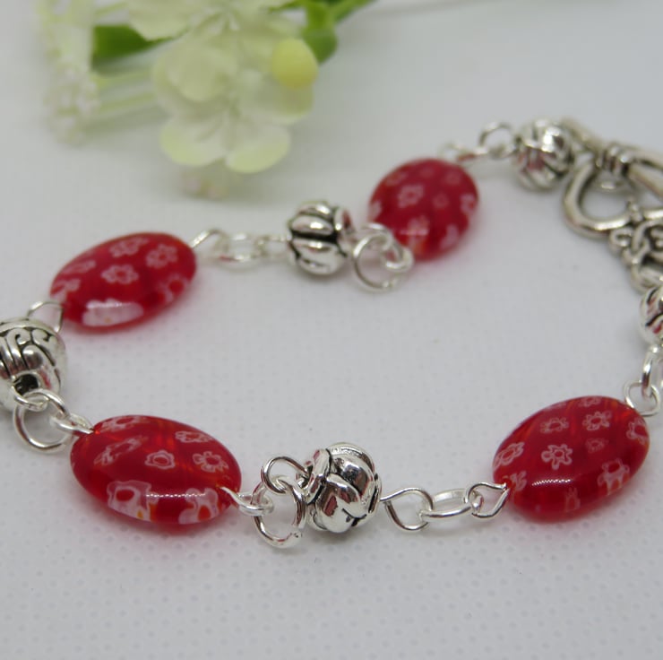 Red millefiori beads with white flowers are the main feature in this bracelet. The glass beads are securely threaded onto silver plated copper wire, interspersed with tibetan style beads and fastened with a simple heart shape toggle clasp.
