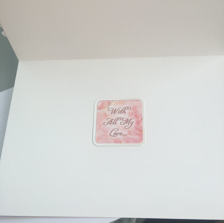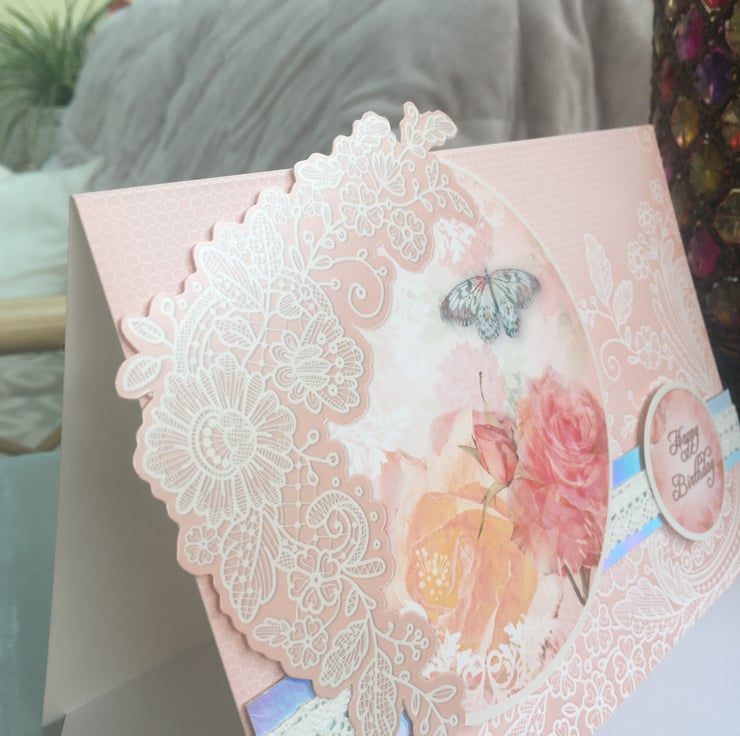 A truely feminine and lovely birthday card. This peach and white birthday card would be just the thing for anyones Mum or Gran. Such a delicate design with white lace and a floral motif. The main card has a band of rainbow silver mirroe card with a strip of crocheted lace as decoration. The main topper is shaped around the lace pattern with full roses and a butterfy. The greeting is Happy birthday. Inside the card is a matching greeting which says With all my love. Lovely