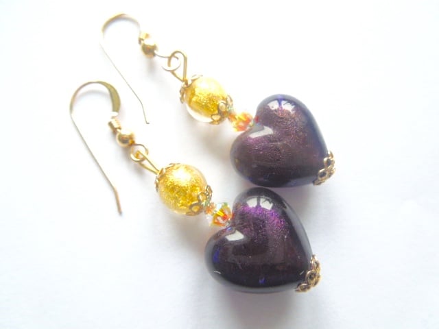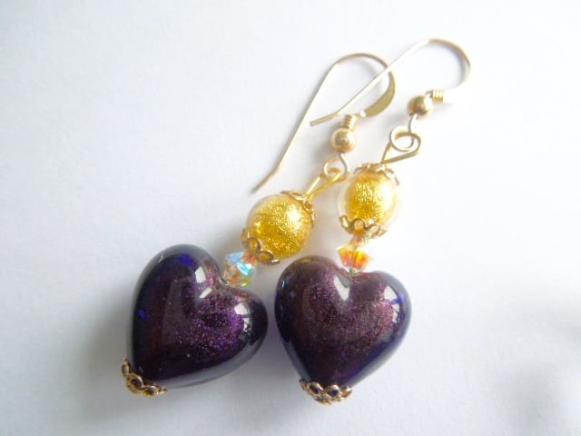 A gorgeous pair of Murano glass heart earrings with plum (dark purple) 24k white gold foiled heart beads (14mm) and 24k gold foiled gold Murano glass round beads with Swarovski crystal beads. The earrings hang from 14k gold filled gold ear wires and measure 30mm in length excluding wires. They are presented in a pretty gift pouch..