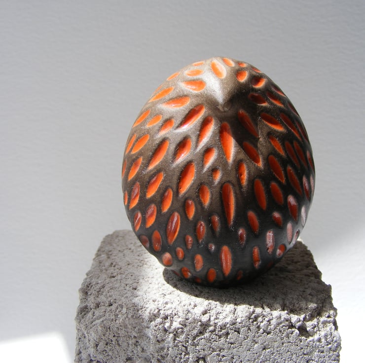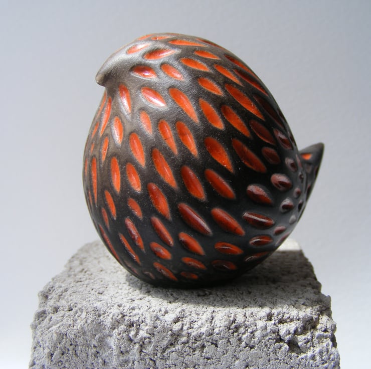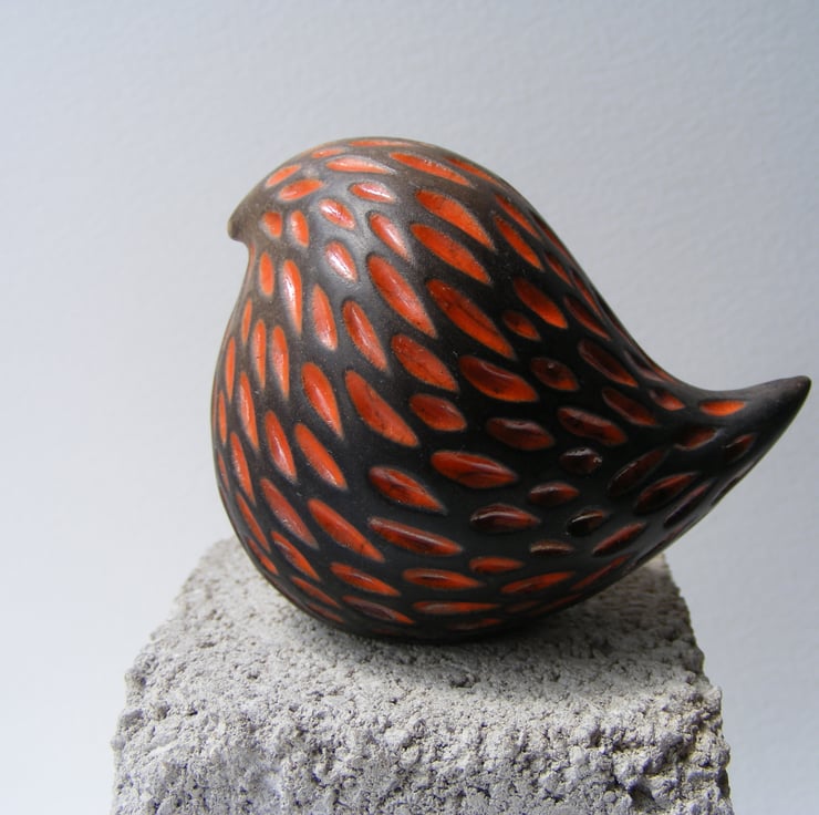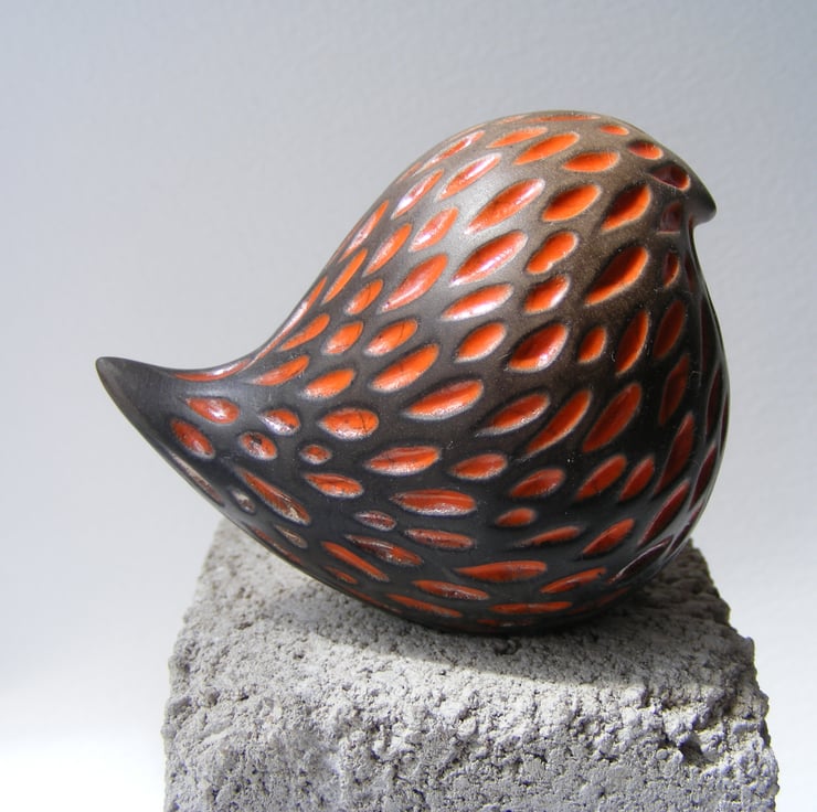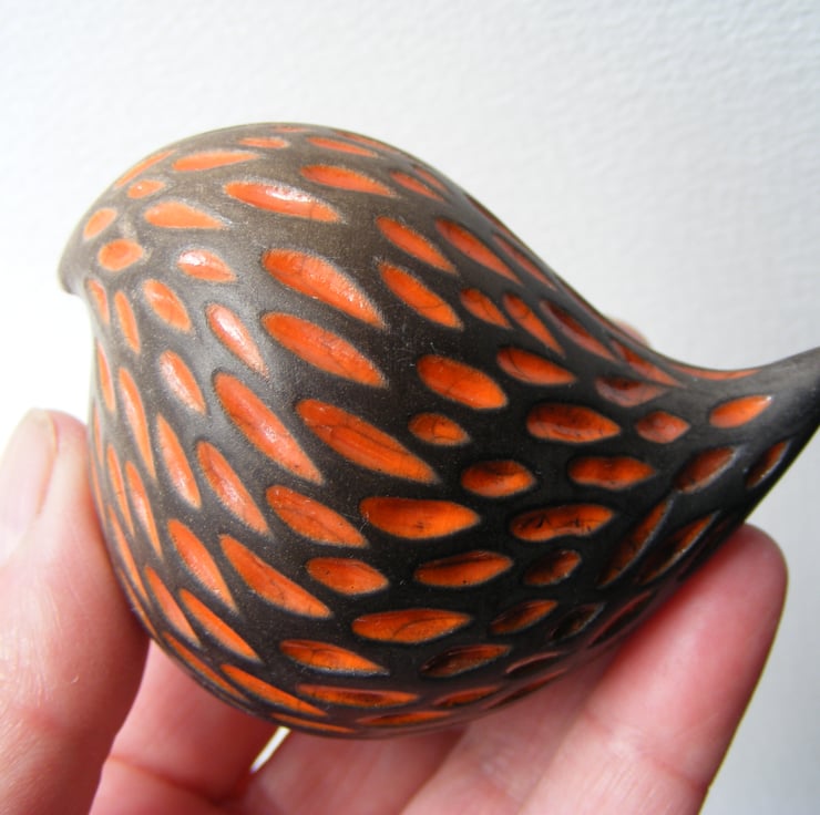 This bird is hand made and measures, approx 5.5cm high and 6.8cm long. It is made from white earthenware clay and when leather hard I used a metal tool and carved out small dents in the surface. I then smoothed out any sharp bits then dried and fired it in an electric kiln. After firing several coats of glaze are painted on and with a sponge it is wiped back, off the surface leaving the glaze in carved dents. It is then raku fired in a gas kiln and then smoked in a bucket of sawdust the unglazed parts turn black. After washing and drying the unglazed parts are polished with bees wax.