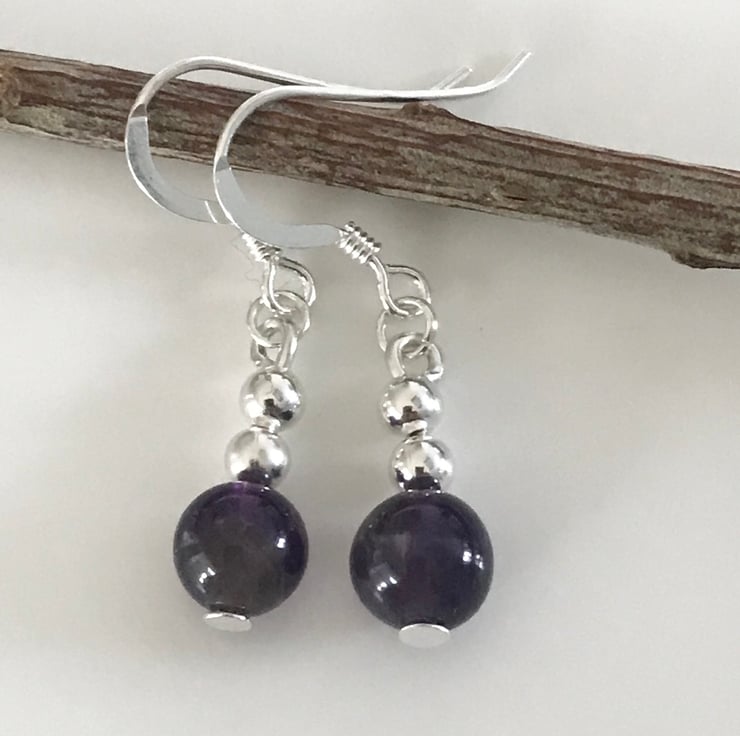 Amethyst semi precious gemstone bead earrings hung on sterling silver ear wires.