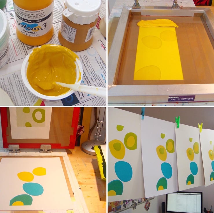 This striking silkscreen print has been produced with a series of paper stencils. I work on A3 screens in my home studio and really enjoy the process of mixing colours and building up designs. This design is based on seeds and cells.