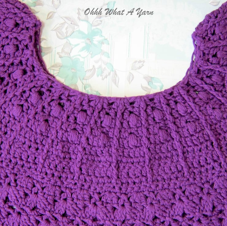 It has a pretty bobble and rib yoke and a decorative shell edge around the armholes.