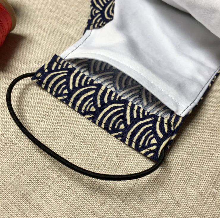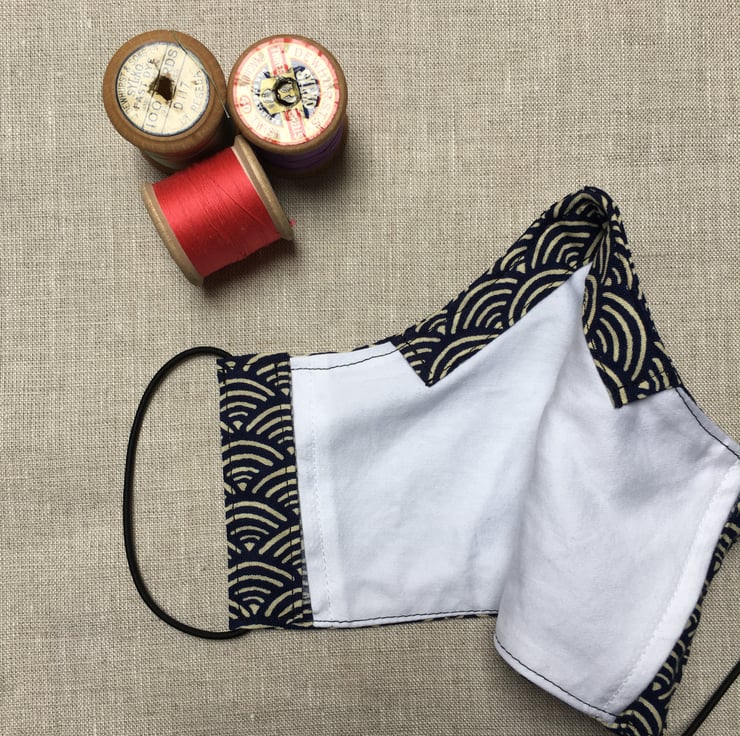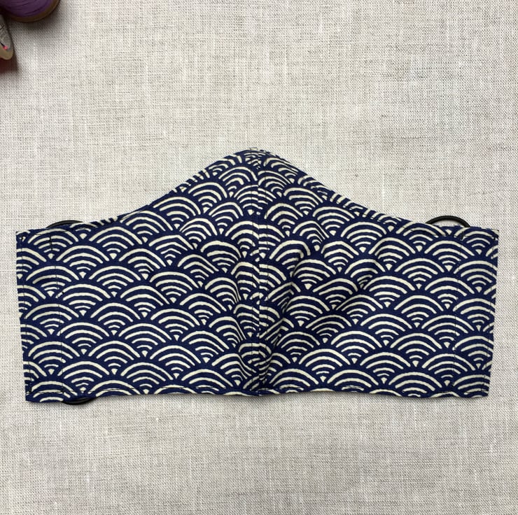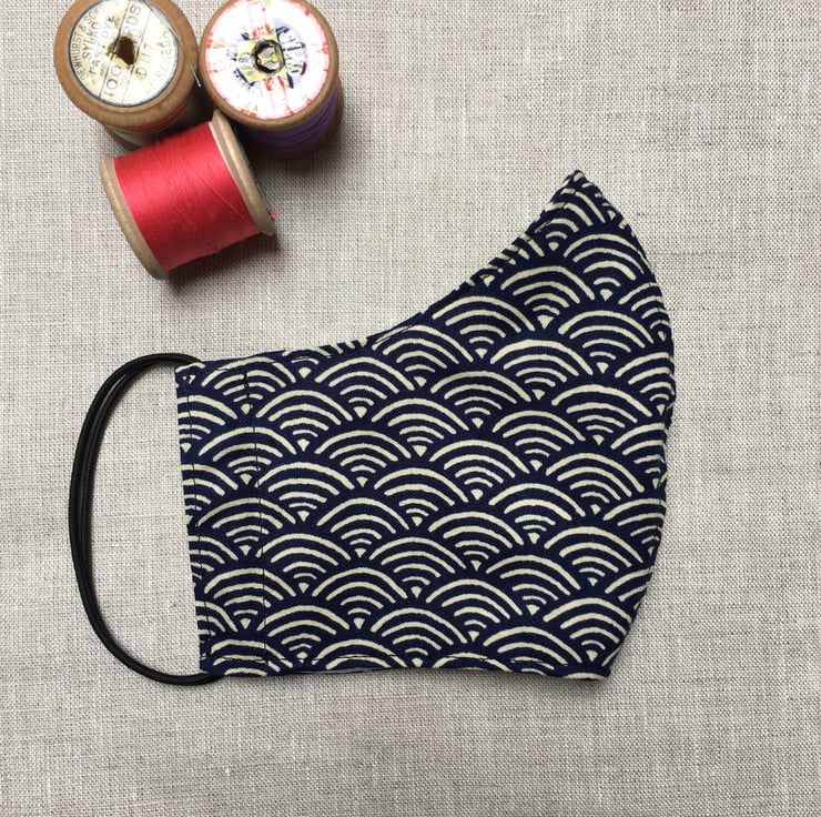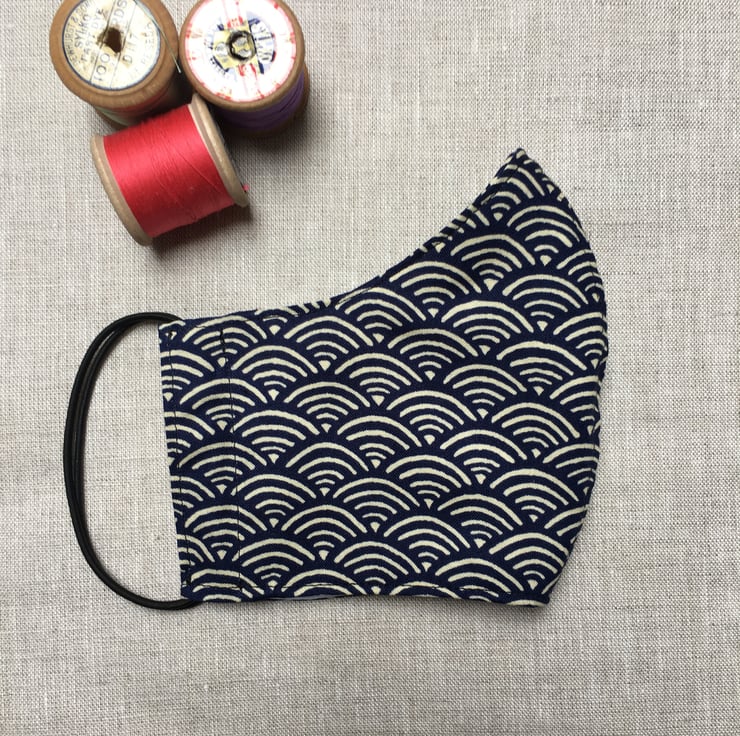 This Japanese fabric uses a design that is made of rows of ocean waves, forming a fan shaped pattern. The pattern creates a stylish and fashionable mask with dark indigo and beige colours. The fabric is high quality cotton and the mask is lined with at least a 400 thread count cotton, which is extremely soft against the skin. The mask is washable & reusable.